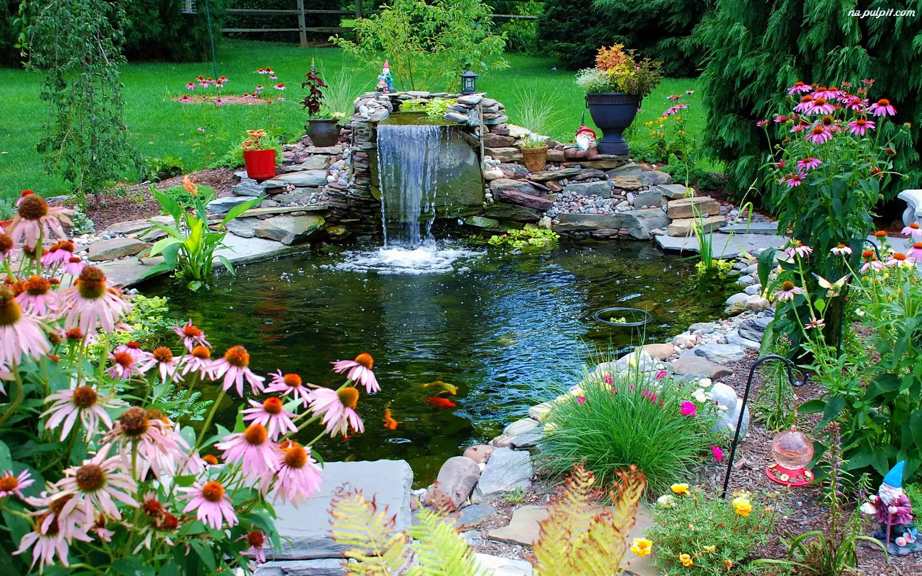 Kwiaty, Wodne, Oczko, Ogród, Kaskada Na Pulpit