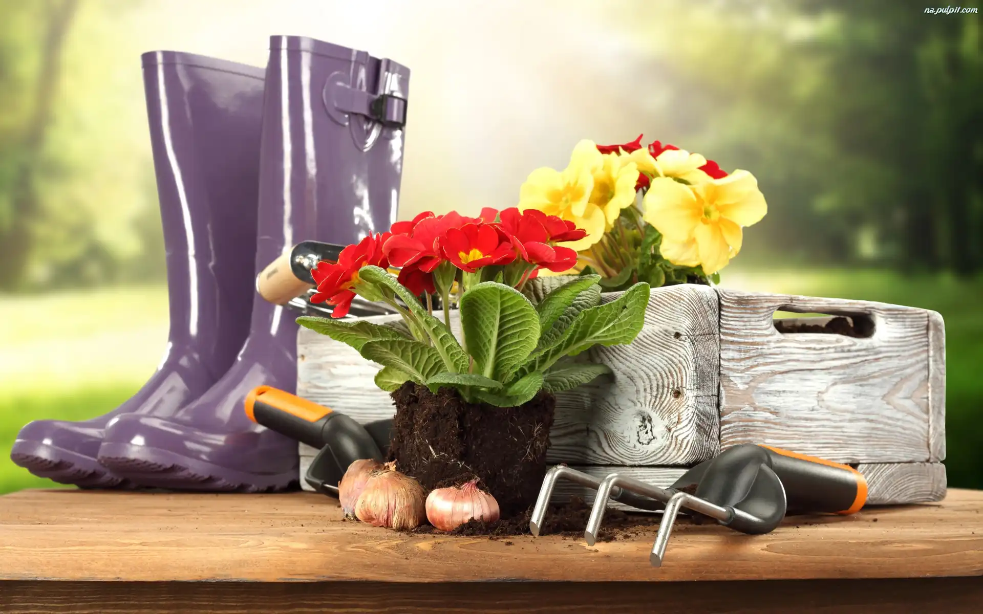 Kwiaty, Kalosze, Skrzynka, Pierwiosnki, Ogród, Narzędzia Na Pulpit
