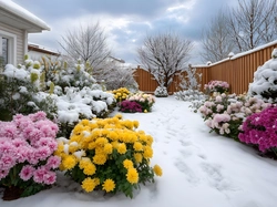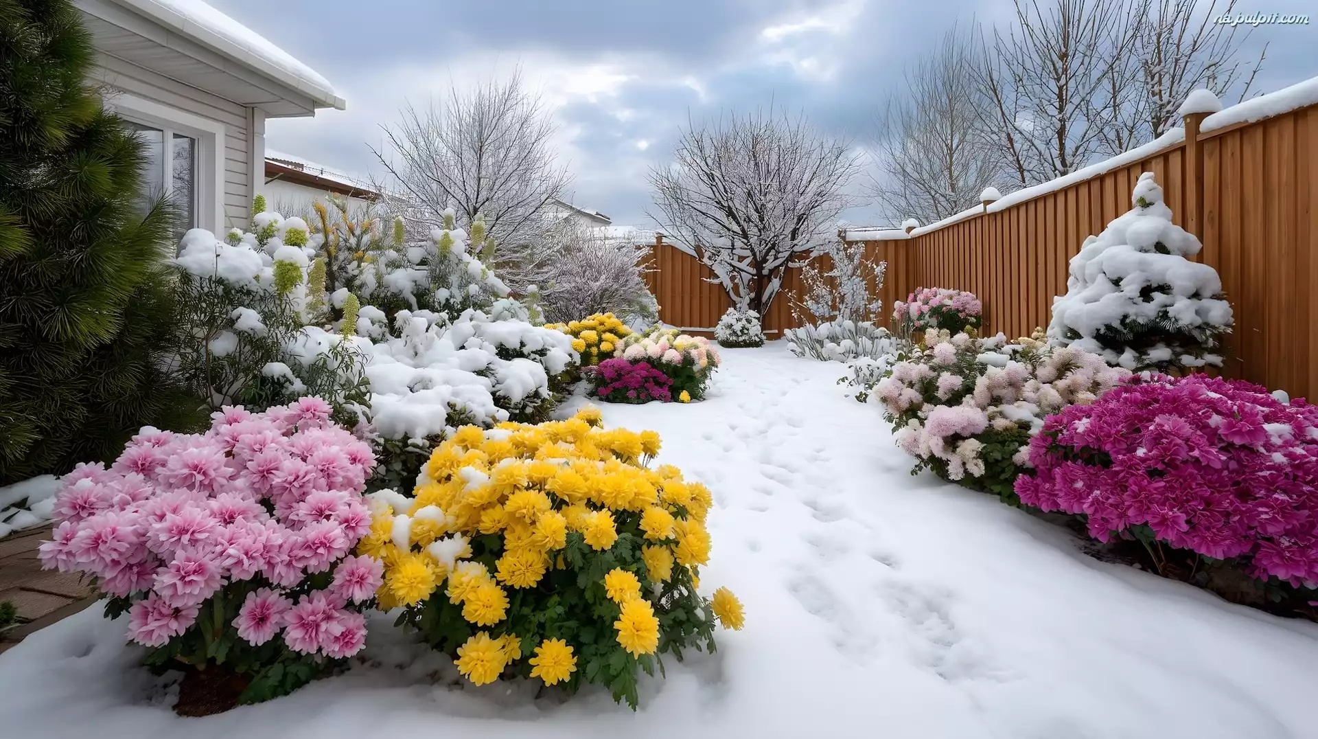 Dom, Ogród, Krzewy, Kwiaty, Zima, Ogrodzenie