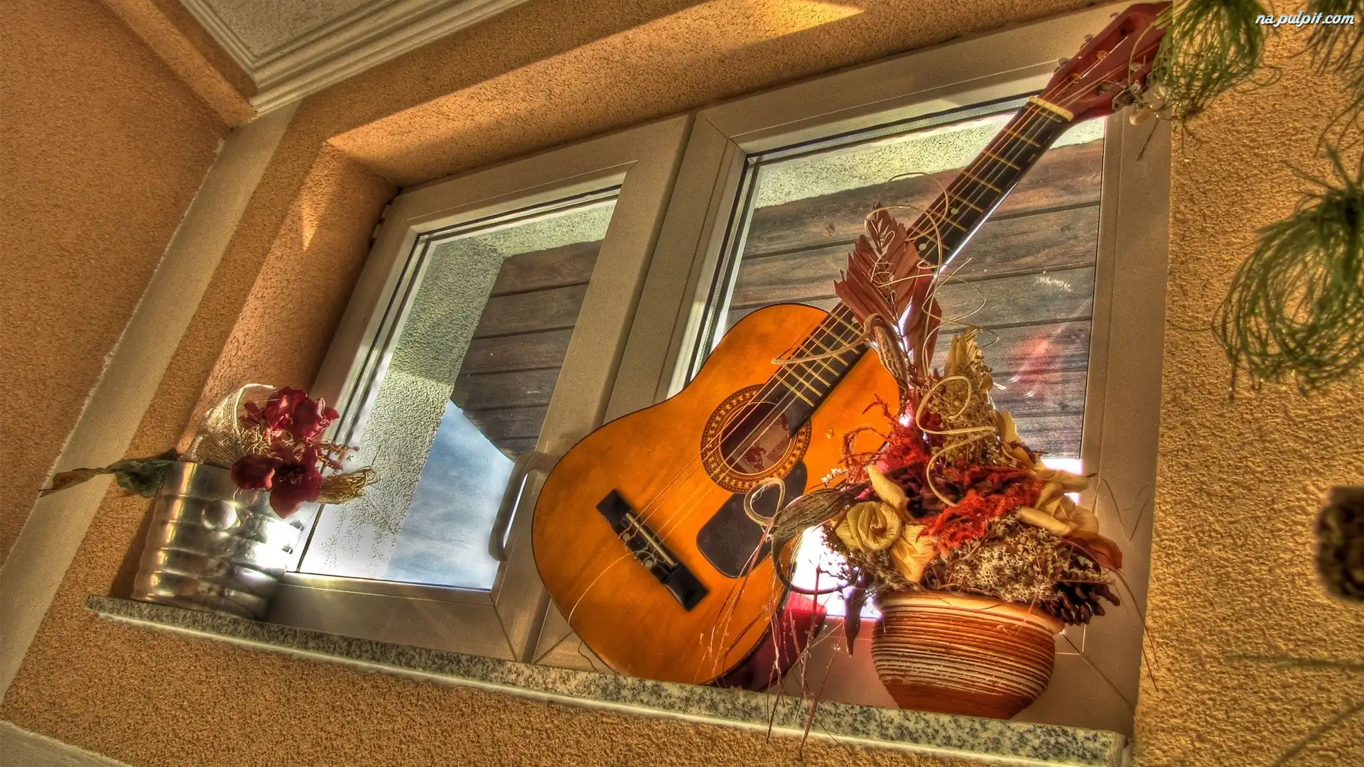 Kwiaty, Dekoracja, Gitara, Okno, Suszone