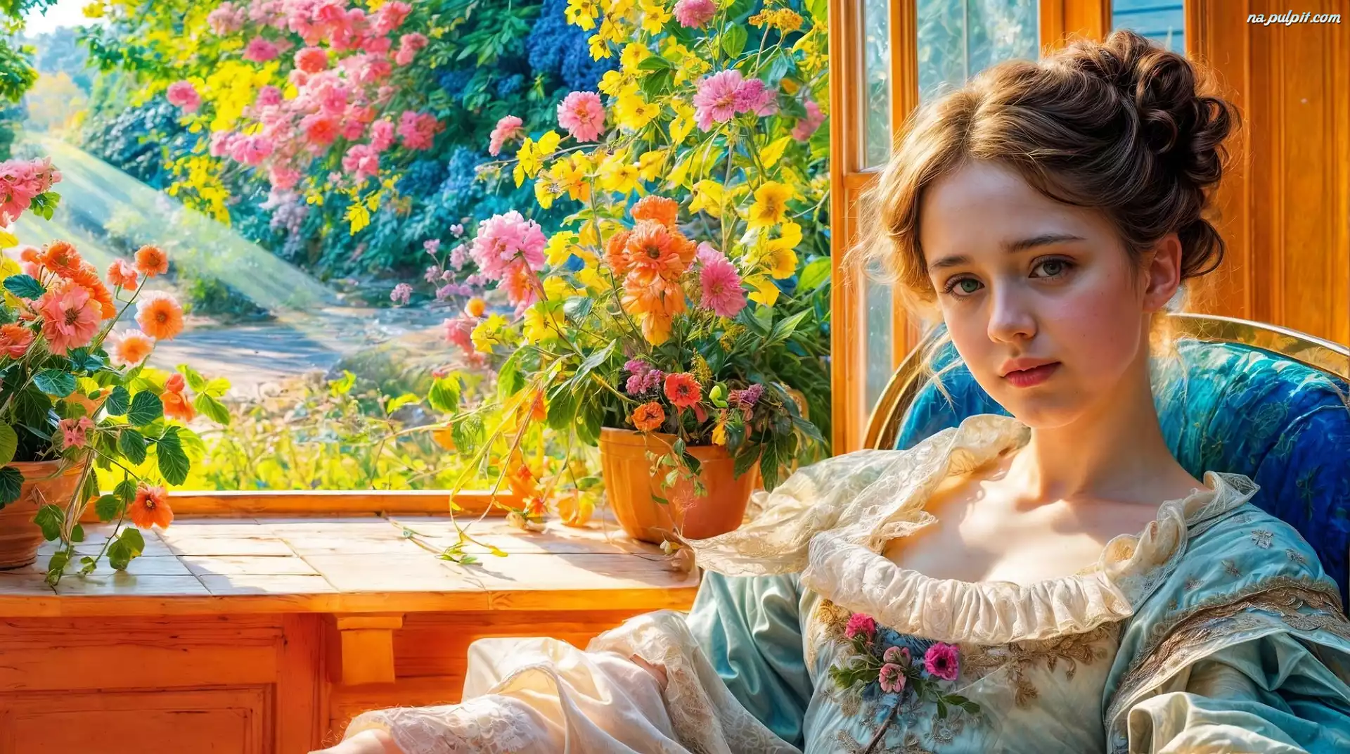 Donice, Spojrzenie, Okno, Kobieta, Grafika, Ogród, Suknia, Kwiaty
