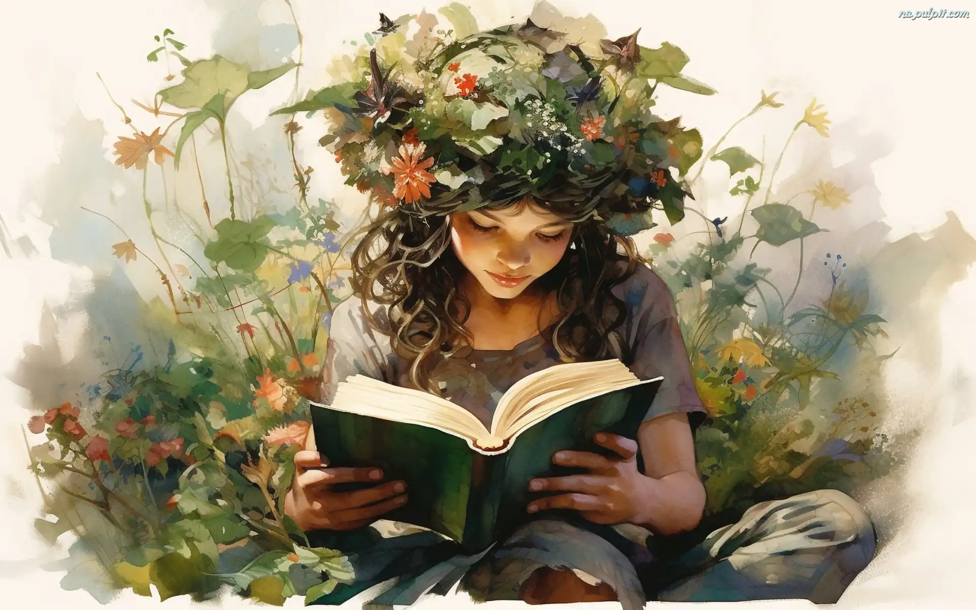 Wianek, Dziewczyna, Liście, Kwiaty, Książka, Paintography Na Pulpit