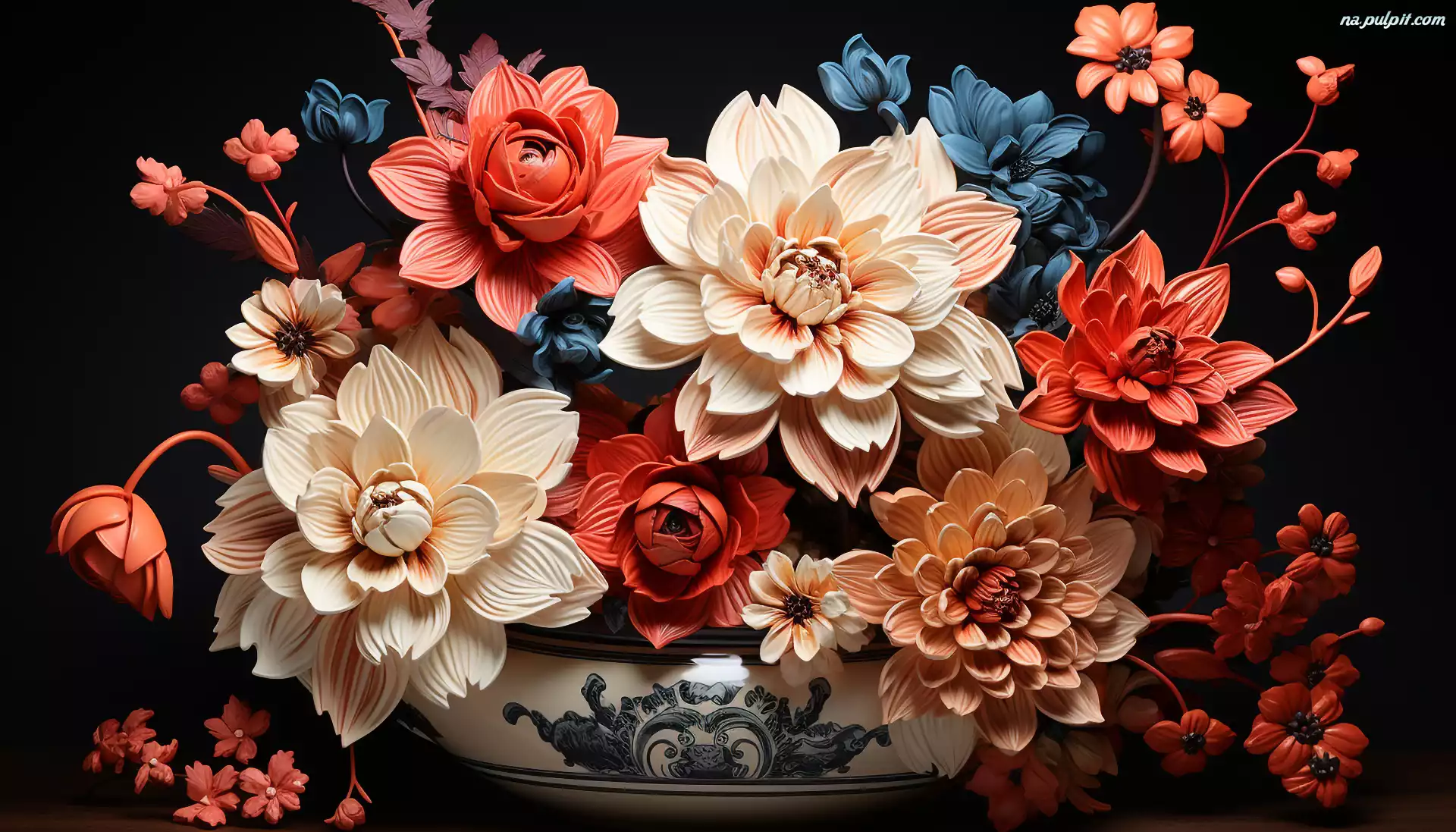 Grafika, Liście, Pąki, Kwiaty, Kolorowy, Bukiet, Wazon
