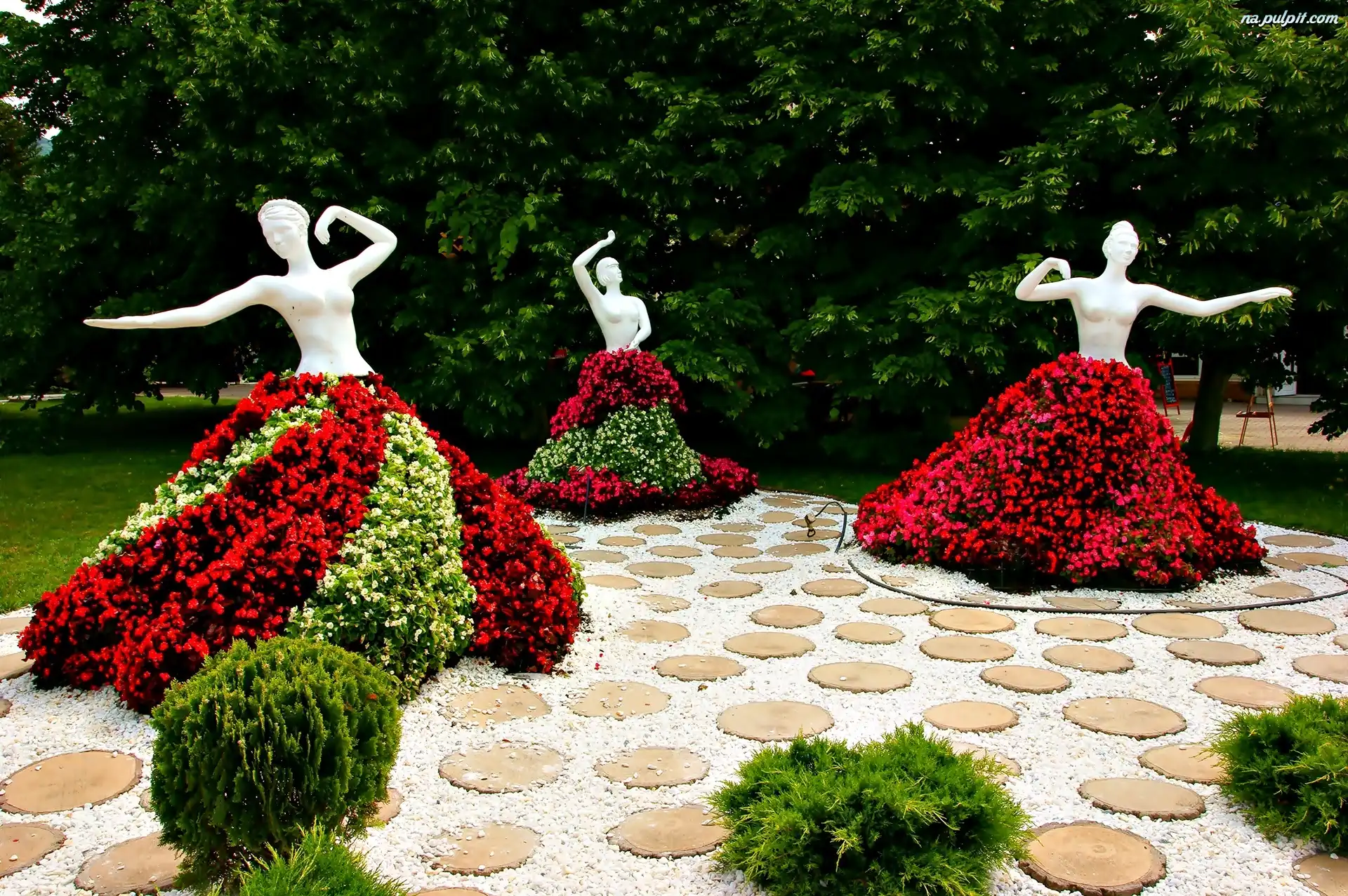 Kwiaty, Krzewy, Drzewa, Klomby, Park, Figurki