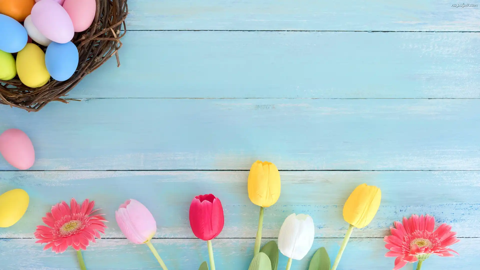 Pisanki, Kwiaty, Deski, Gerbery, Tulipany, Wielkanoc, Niebieskie Na Pulpit