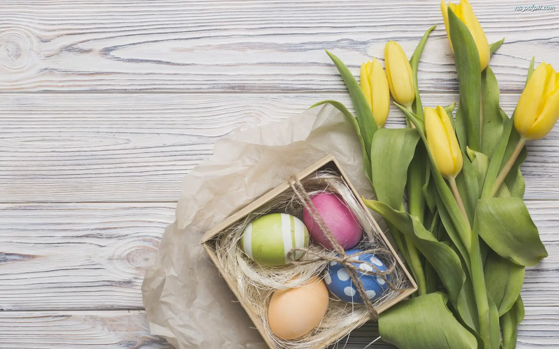Żółte, Pisanki, Kolorowe, Tulipany, Deski, Pudełko, Wielkanoc, Kwiaty