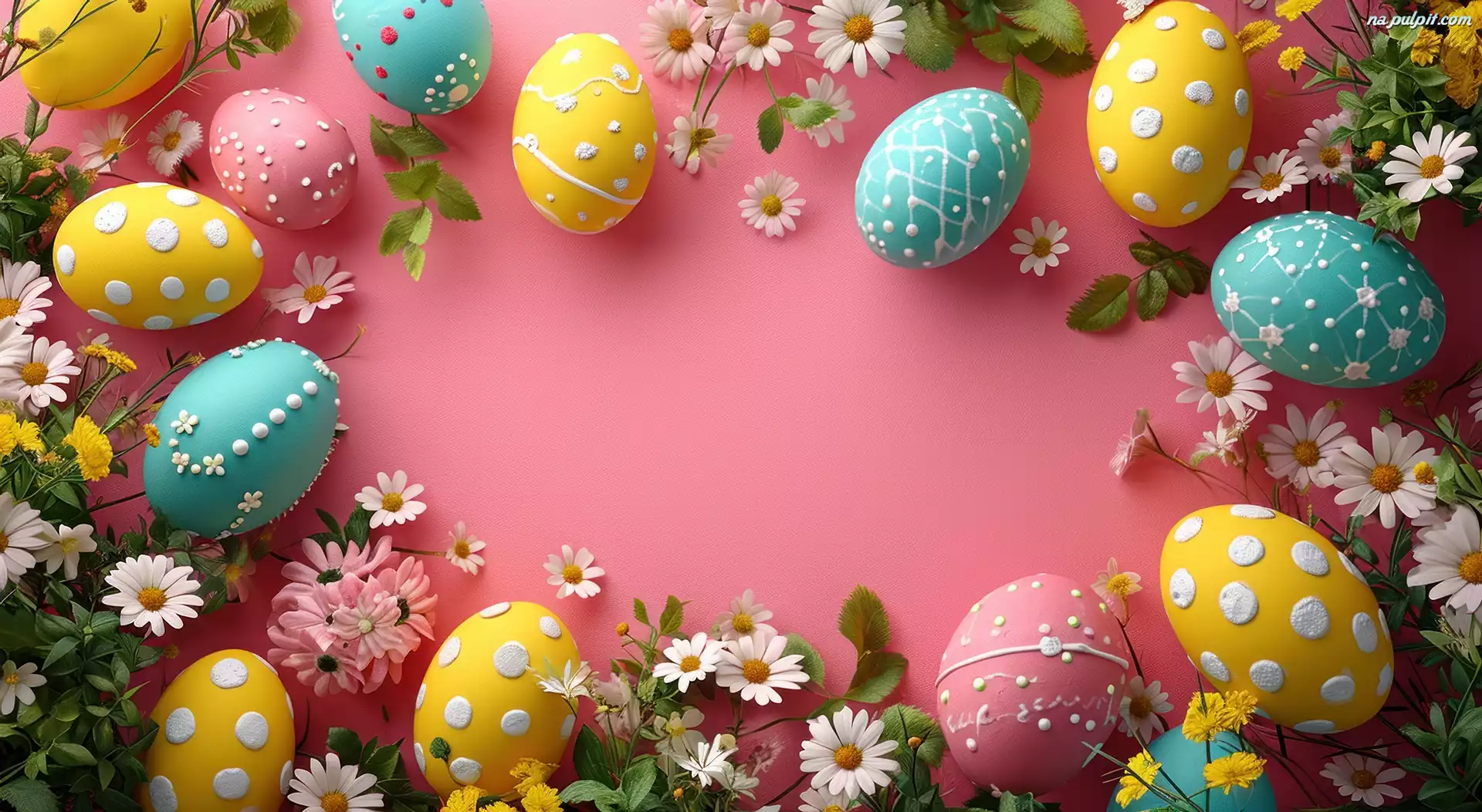 Grafika, Wielkanoc, Pisanki, Kwiaty, Kolorowe, Różowe tło Na Pulpit