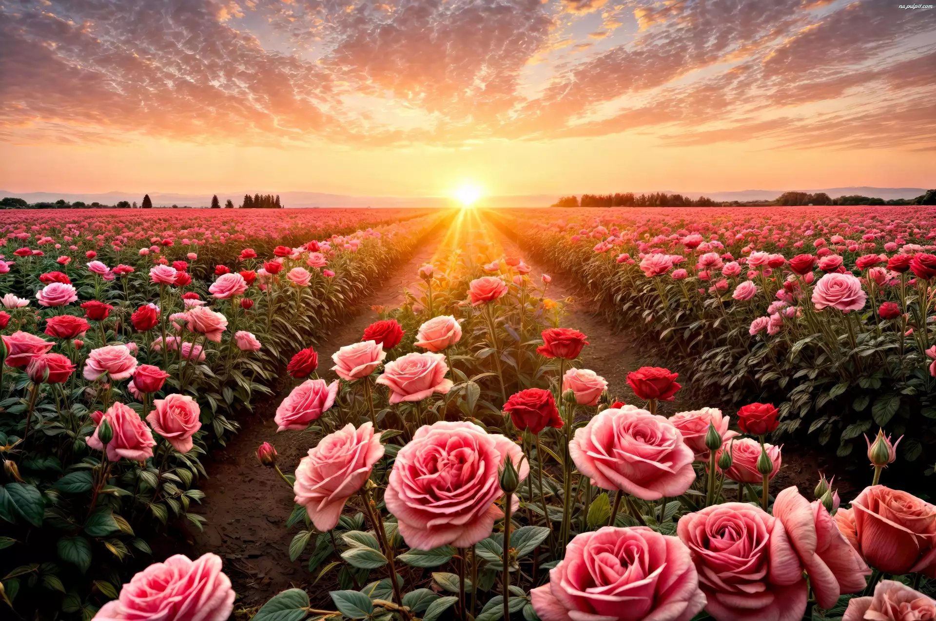 Zachód słońca, Róże, Kwiaty, Grafika, Plantacja Na Pulpit