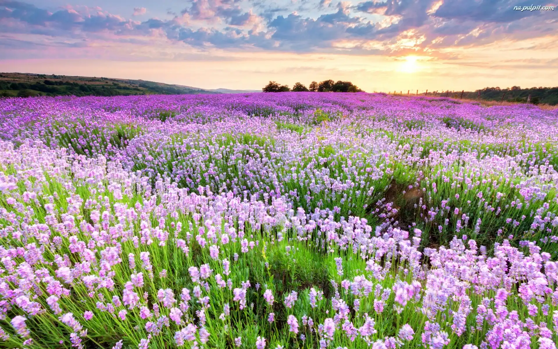Kwiaty, Słońca, Drzewa, Wzgórza, Pole, Zachód
