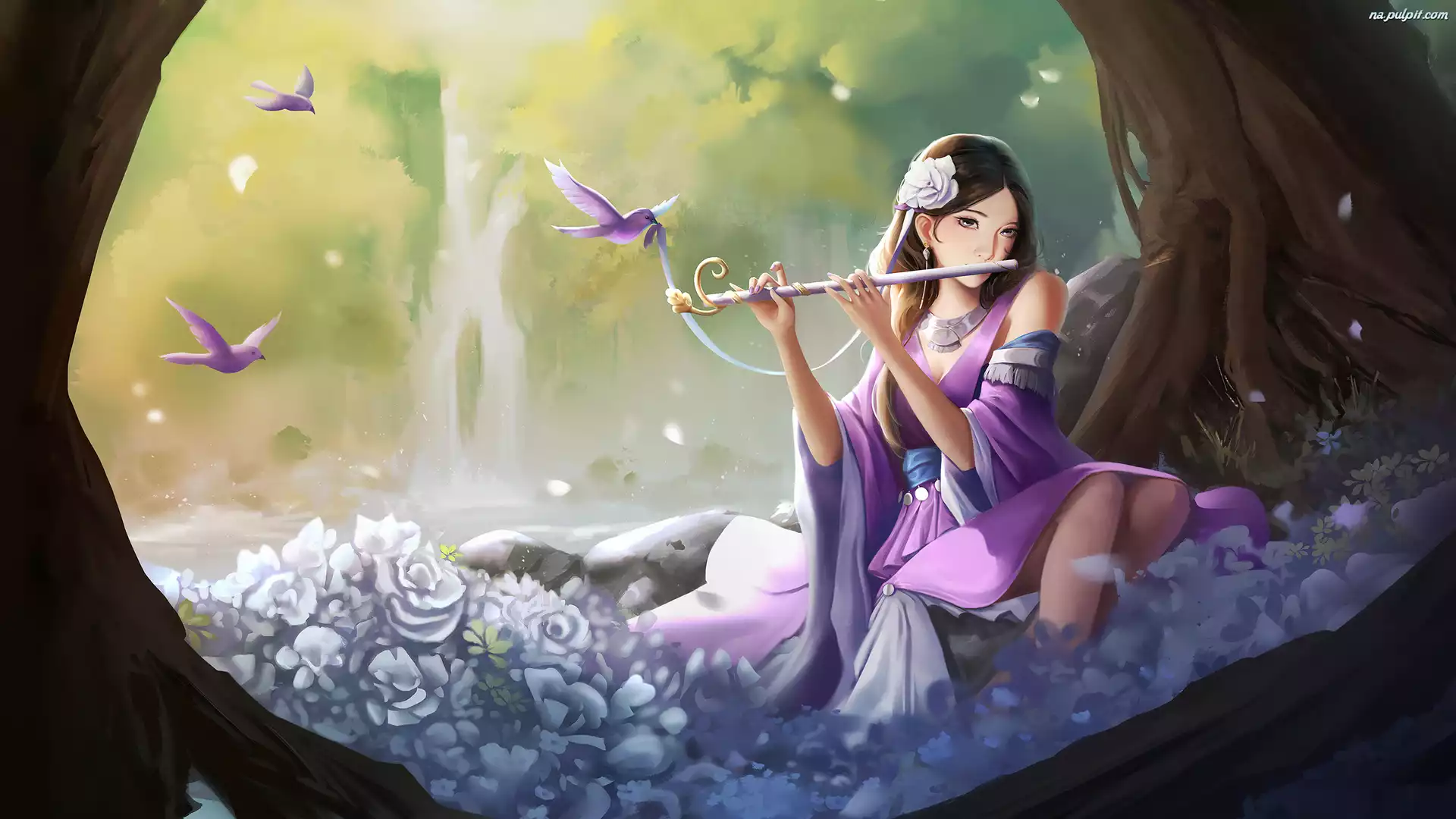Flet, Grafika, Drzewo, Kwiaty, Dziewczyna, Ptaki Na Pulpit