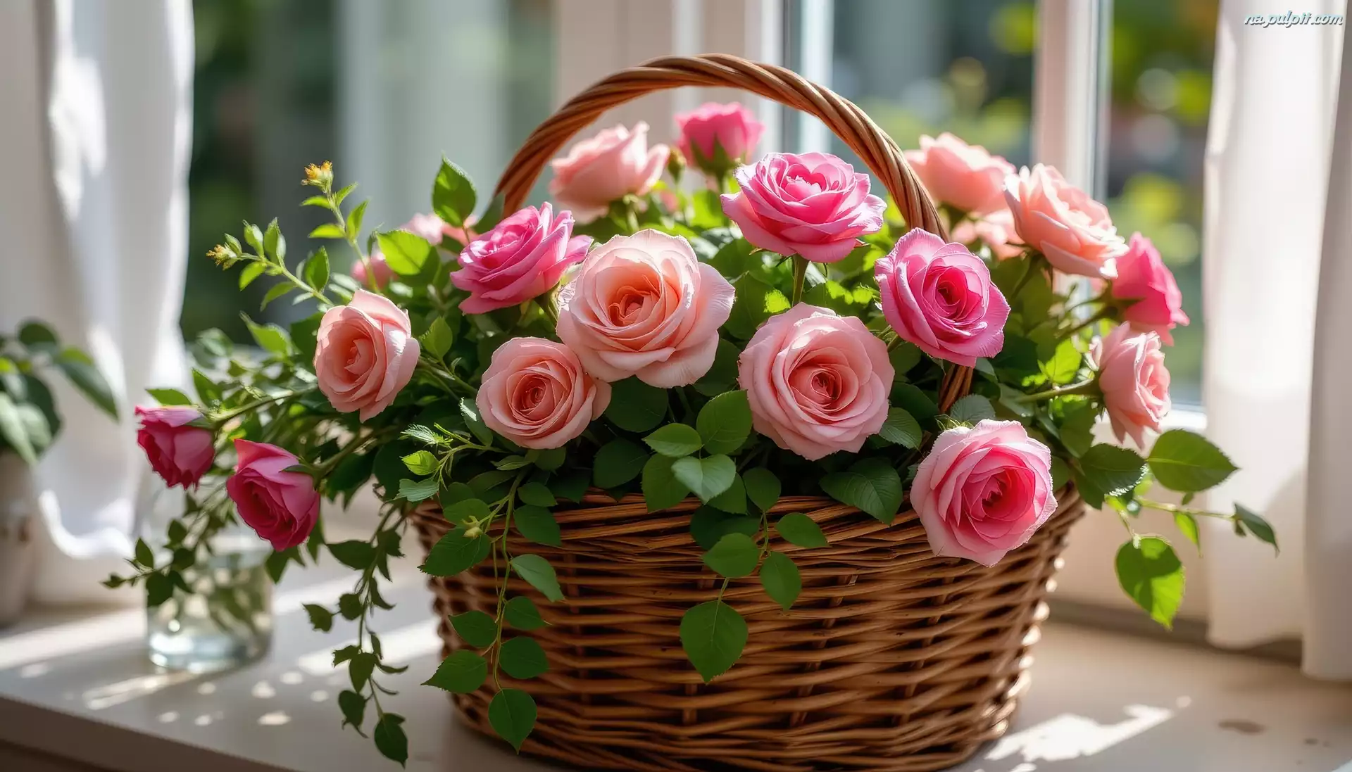 Parapet, Kwiaty, Róże, Okno, Koszyk