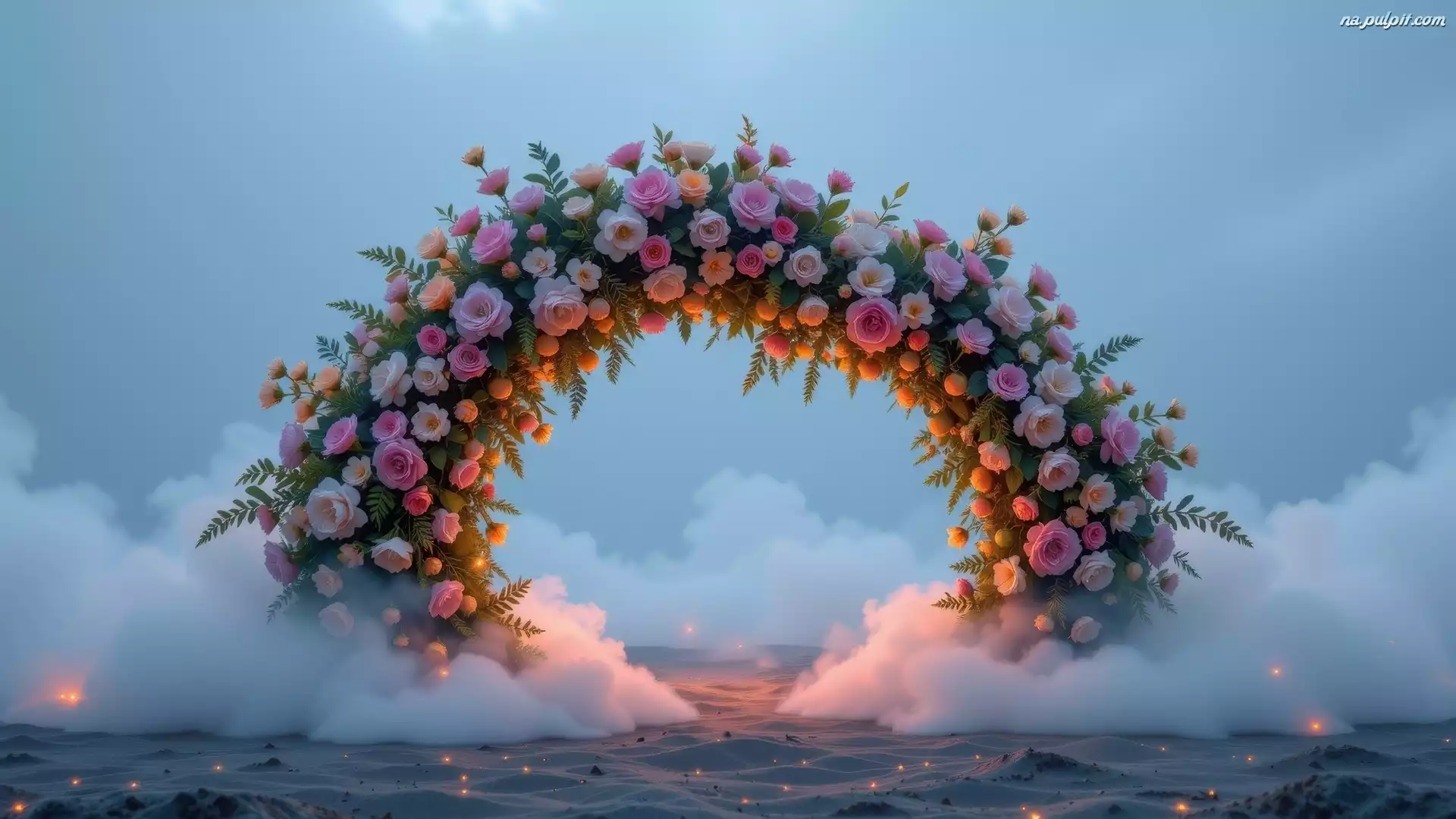 Grafika, Mgła, Róże, Kwiaty, Łuk, Różowe, Piasek Na Pulpit