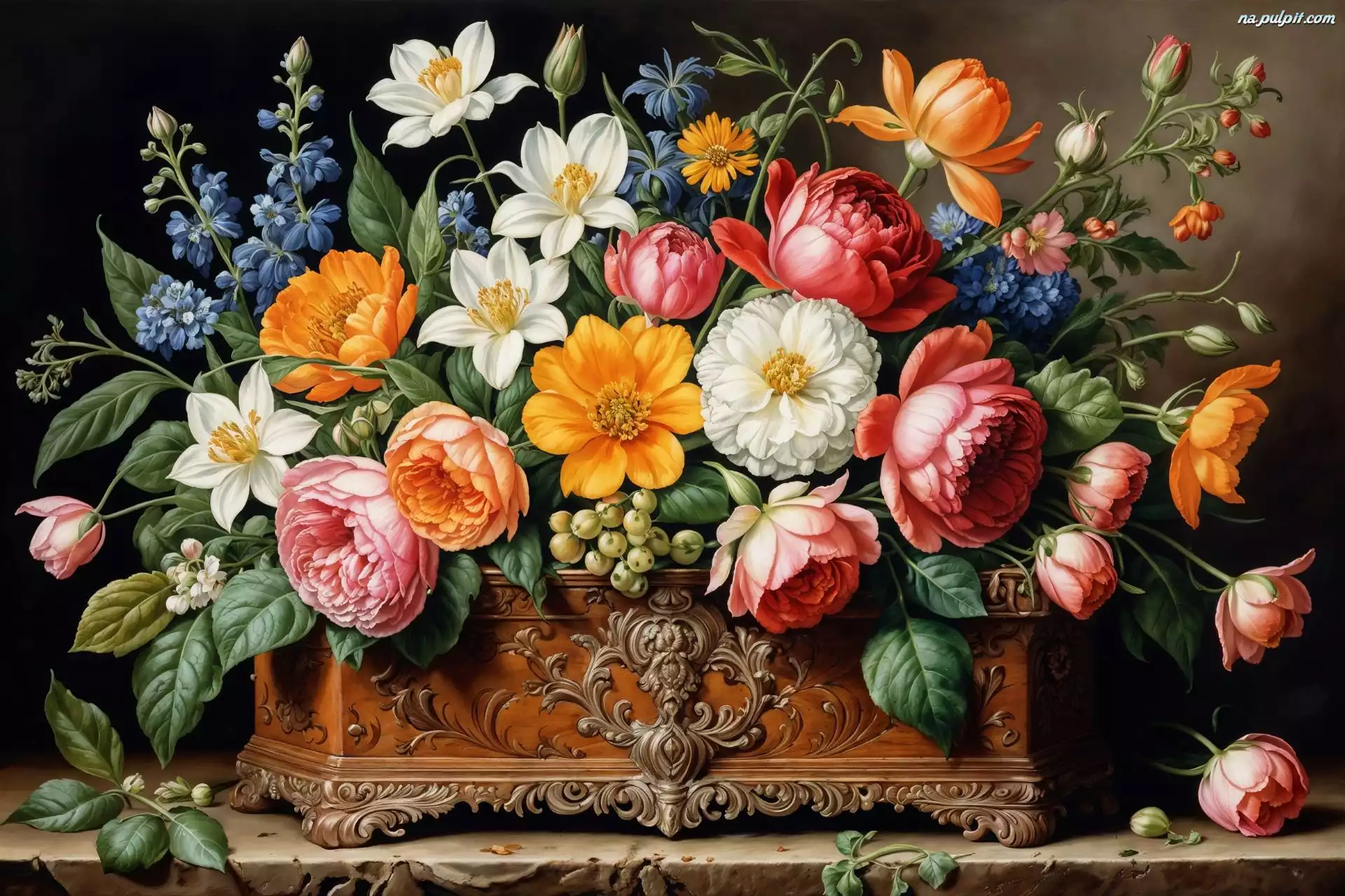 Skrzynka, Kwiaty, Różnokolorowe, Grafika, Bukiet Na Pulpit