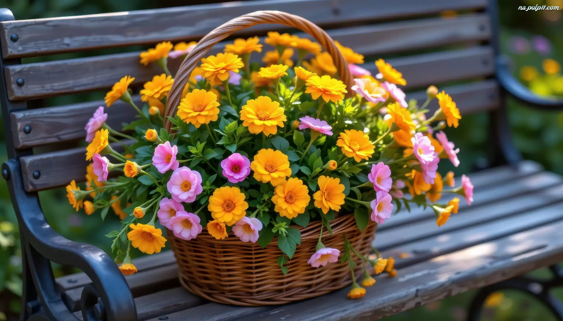 Koszyk, Kwiaty, Różowe, Ławka, Pomarańczowe Na Pulpit