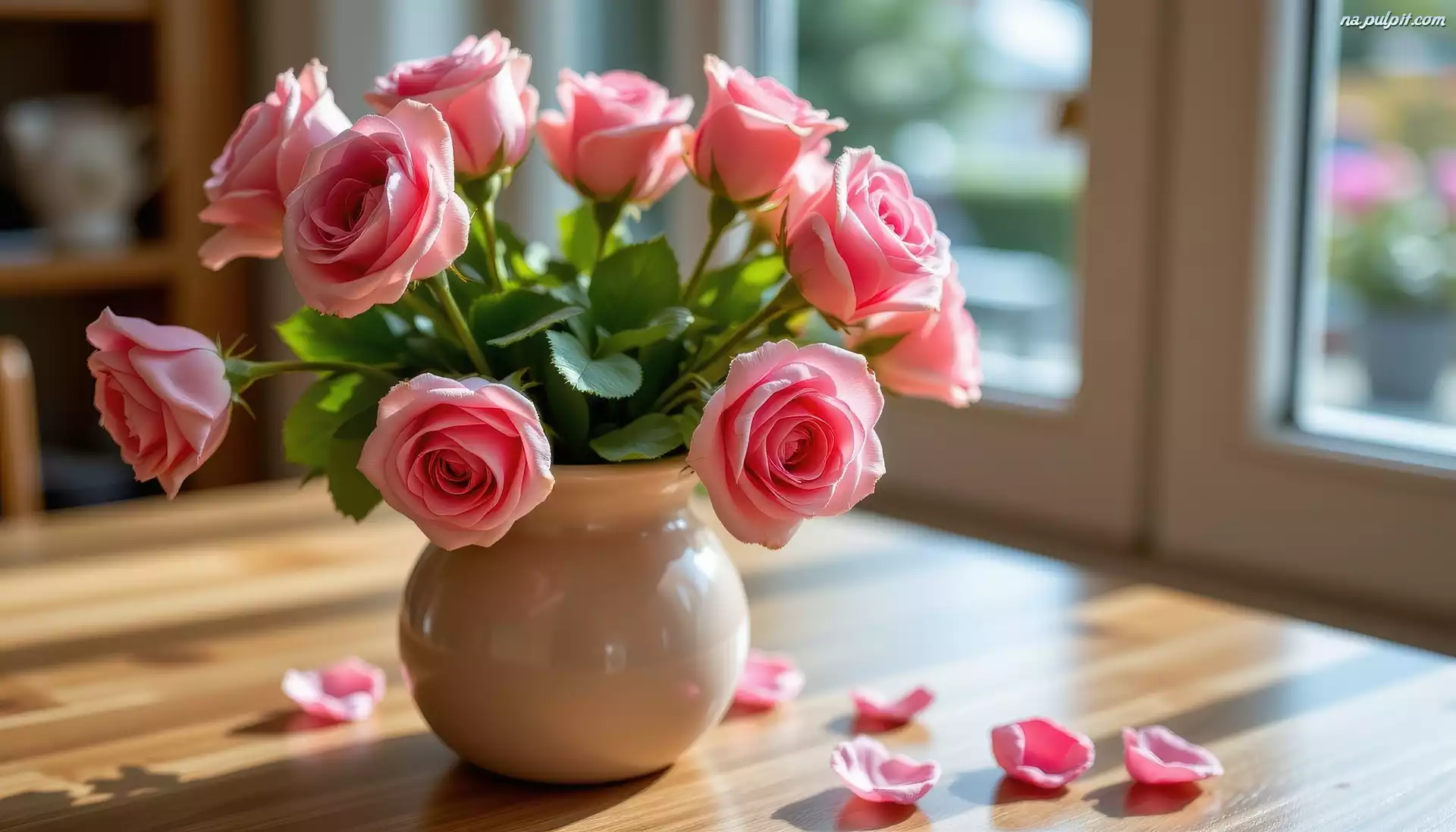Wazon, Kwiaty, Różowe, Stół, Róże Na Pulpit