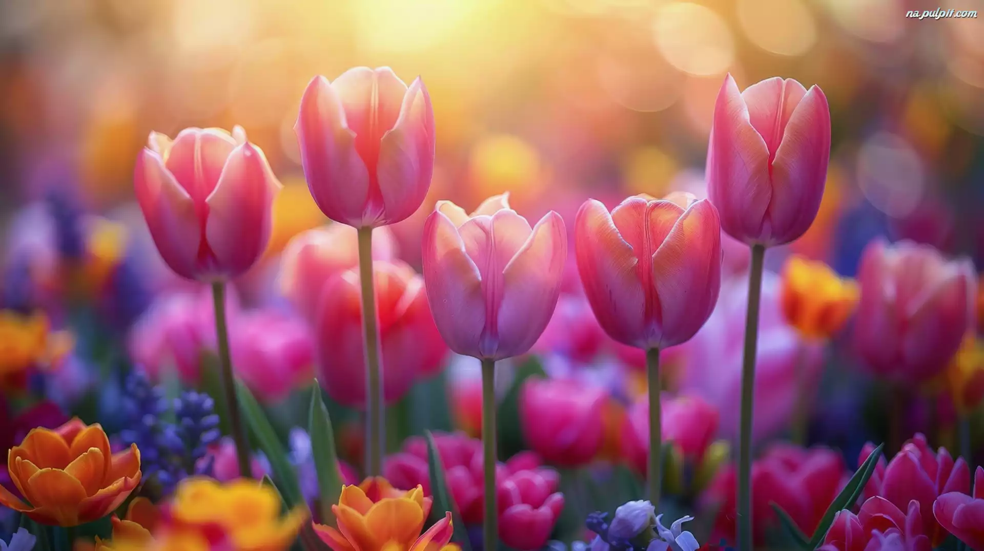Zachód słońca, Tulipany, Kwiaty, Grafika, Różowe Na Pulpit