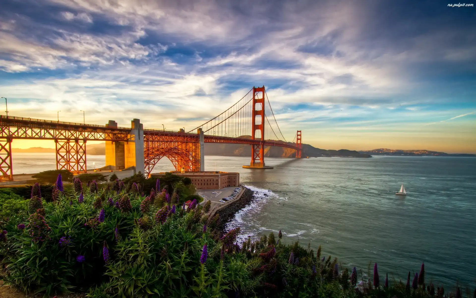 Kwiaty, Most, Rzeka, Żaglówka Na Pulpit