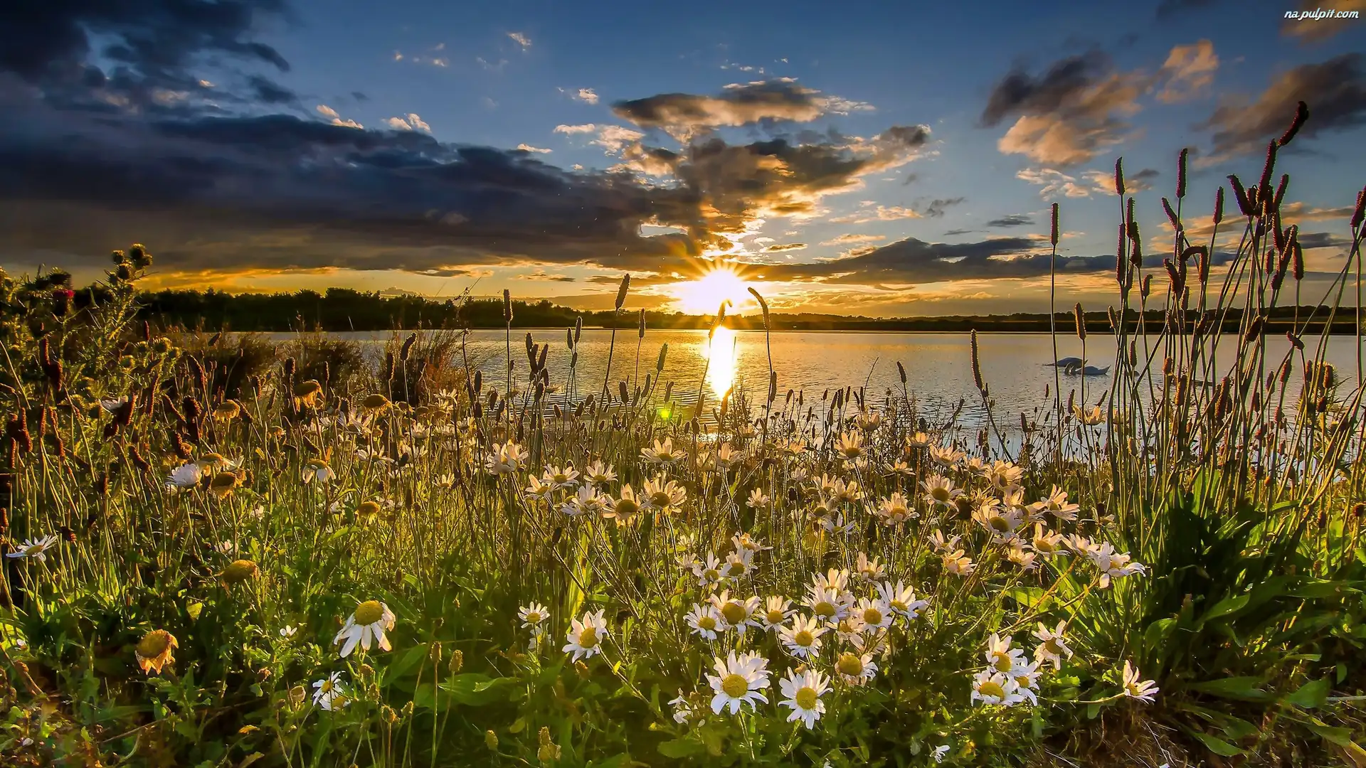Kwiaty, Jezioro, Zachód Słońca, Łąka Na Pulpit