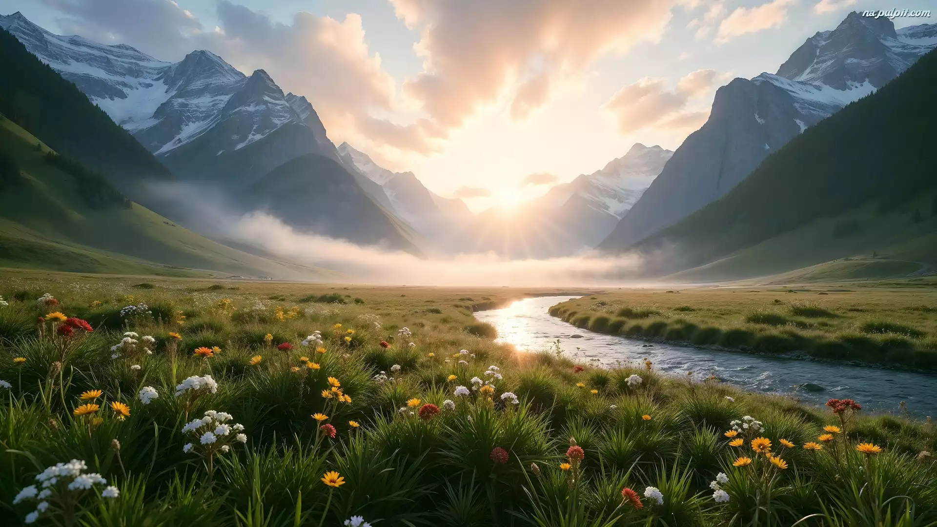 AI, Łąka, Słoneczny blask, Góry, Rzeka, Mgła, Kwiaty Na Pulpit
