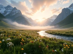 AI, Łąka, Słoneczny blask, Góry, Rzeka, Mgła, Kwiaty