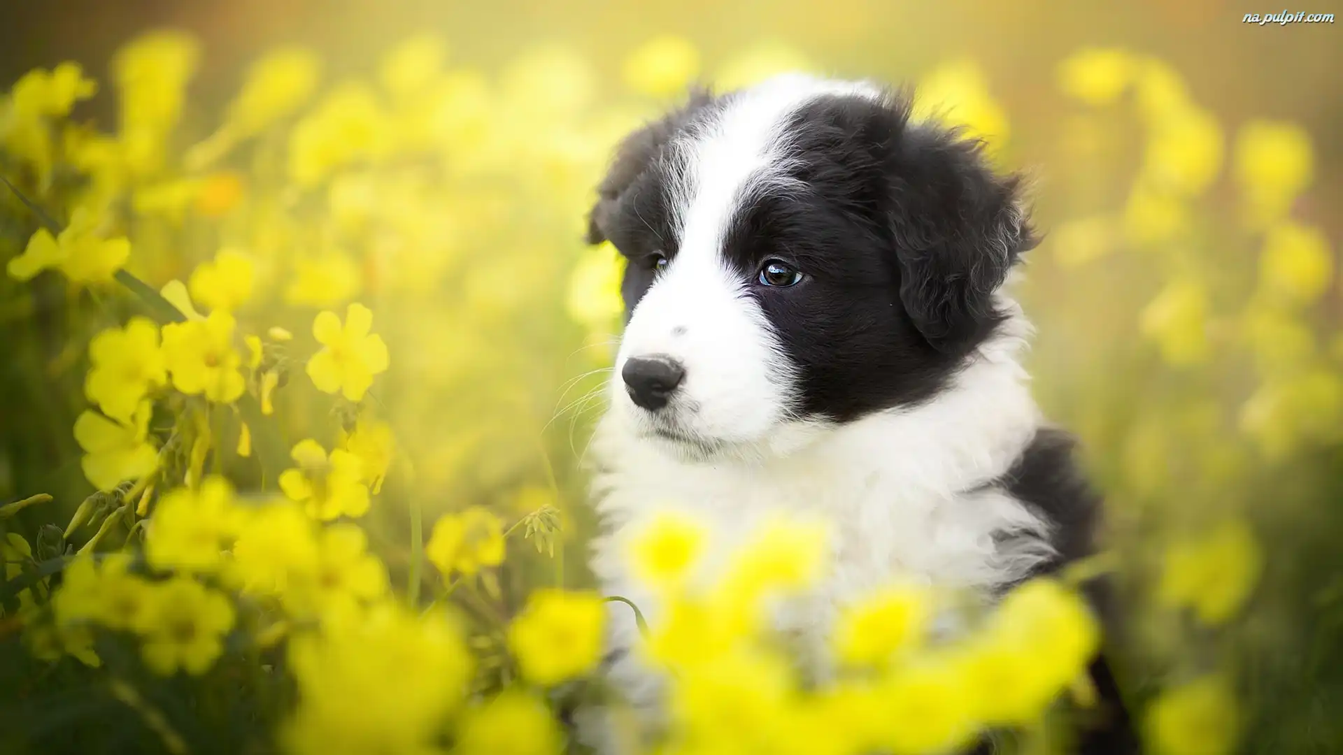 Kwiaty, Łąka, Border collie, Szczeniak, Żółte Na Pulpit