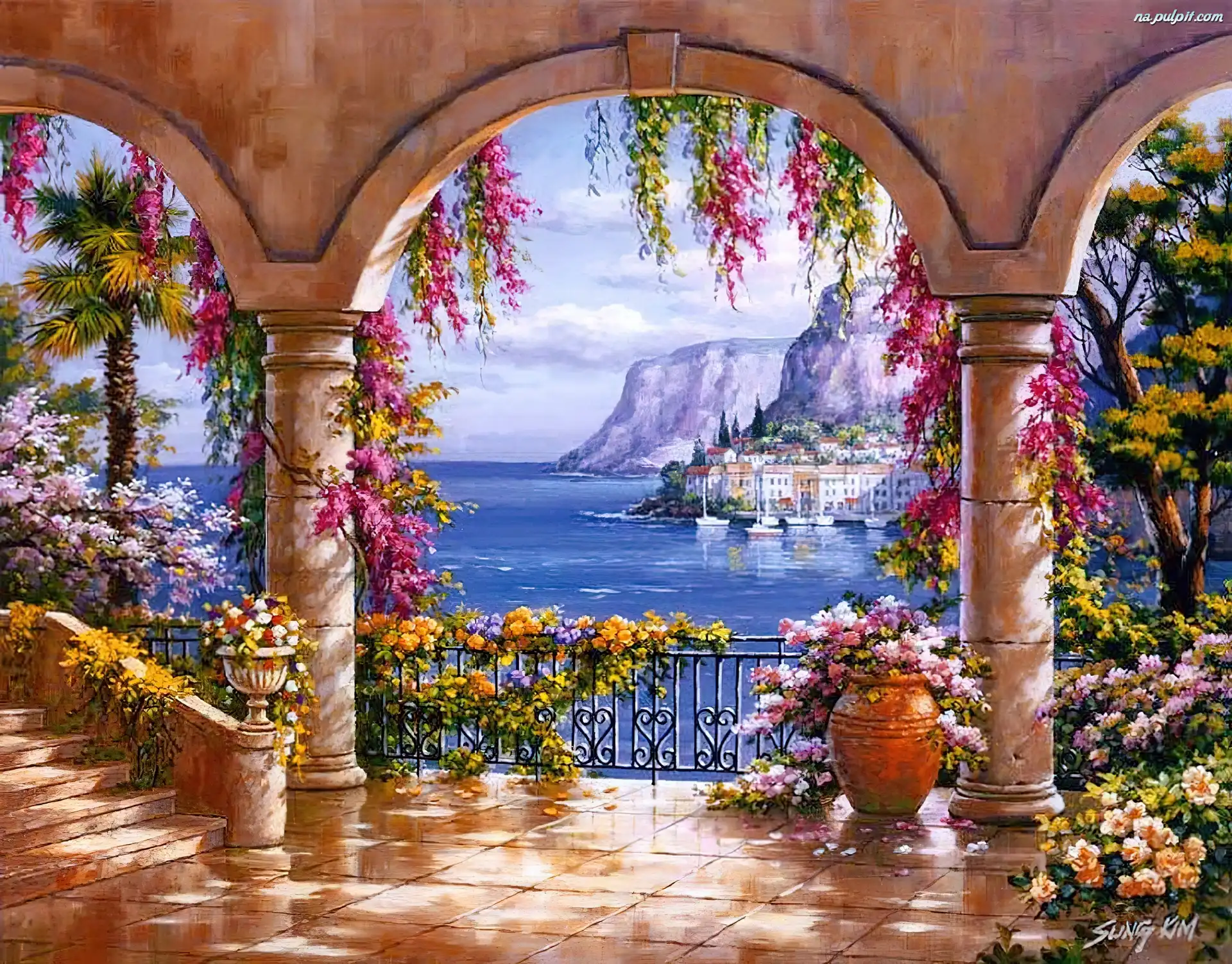 Kwiaty, Morze, Góry, Widok, Taras, Na Na Pulpit