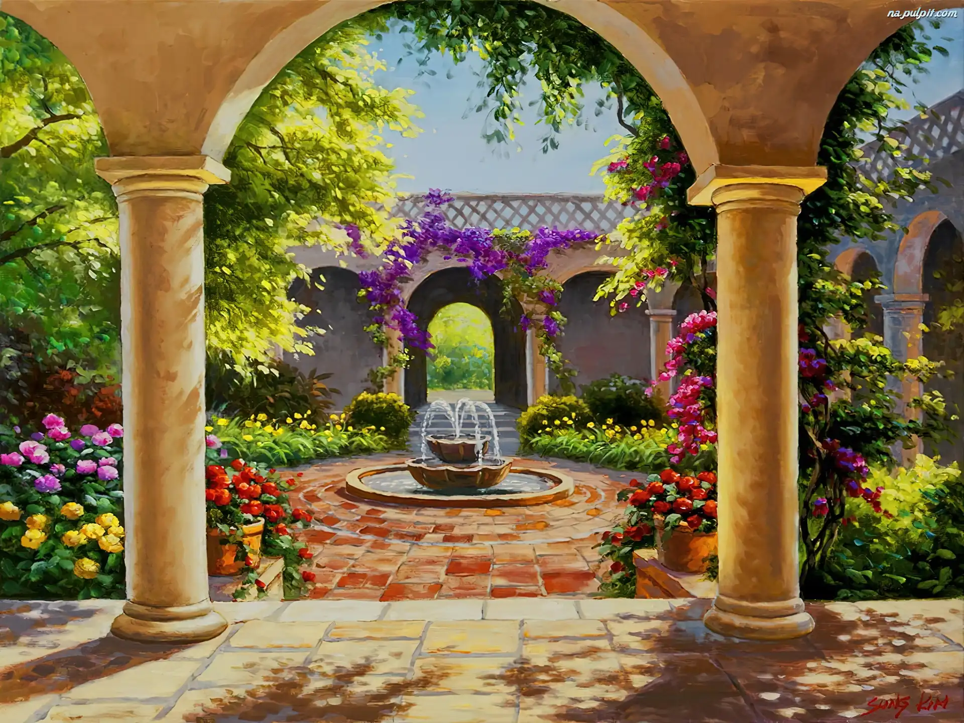 Kwiaty, Ogród, Taras, Fontanna Na Pulpit