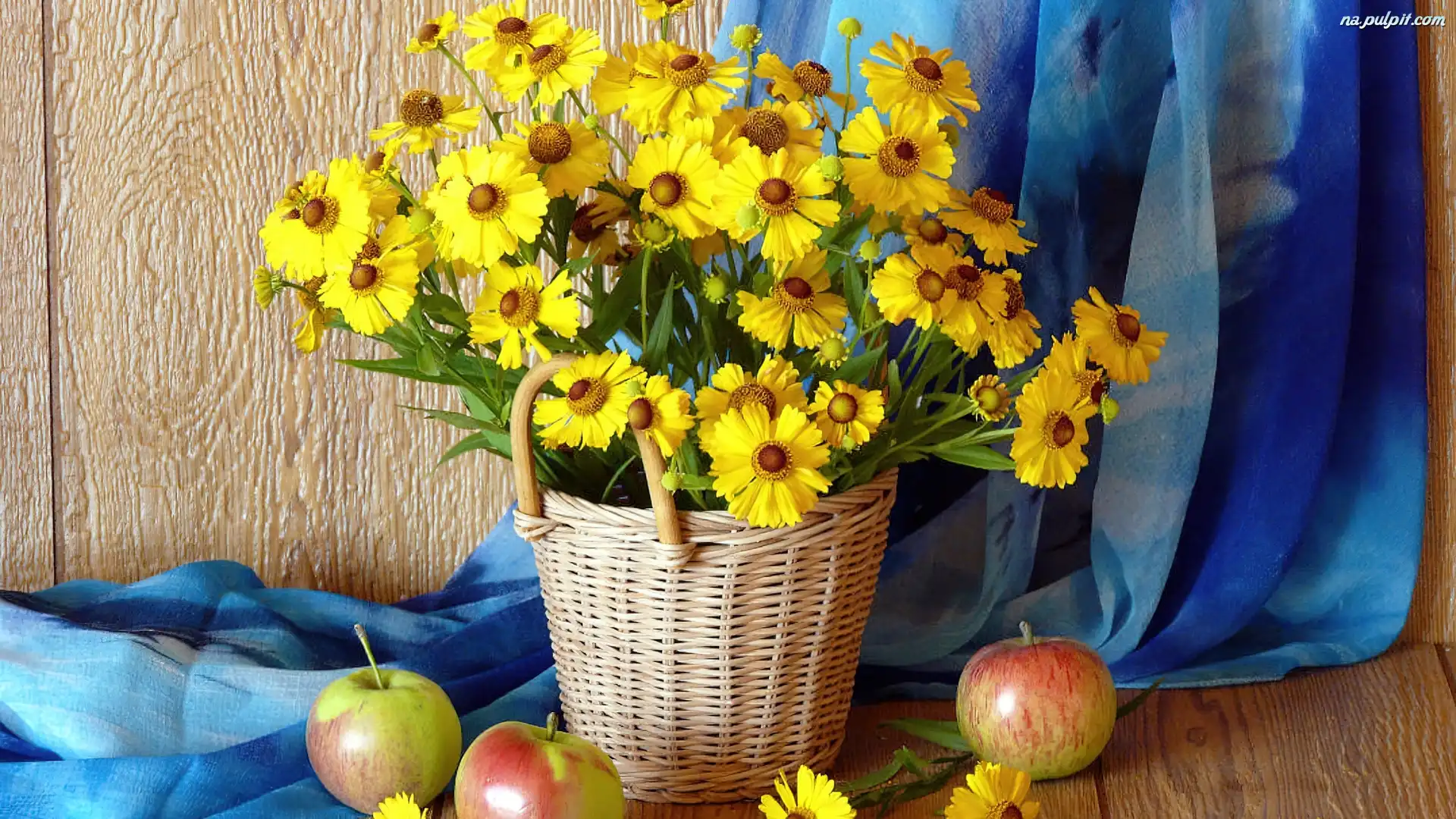 Tkanina, Kwiaty, Niebieska, Kosz, Wiklinowy, Żółte, Jabłka Na Pulpit
