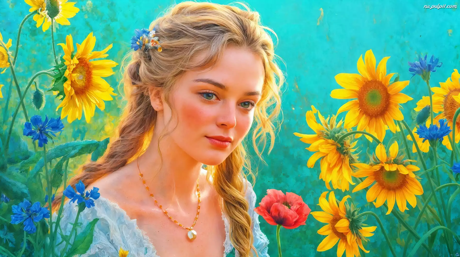 Słoneczniki, Kobieta, Warkocze, Kwiaty, Blondynka, Tło Na Pulpit