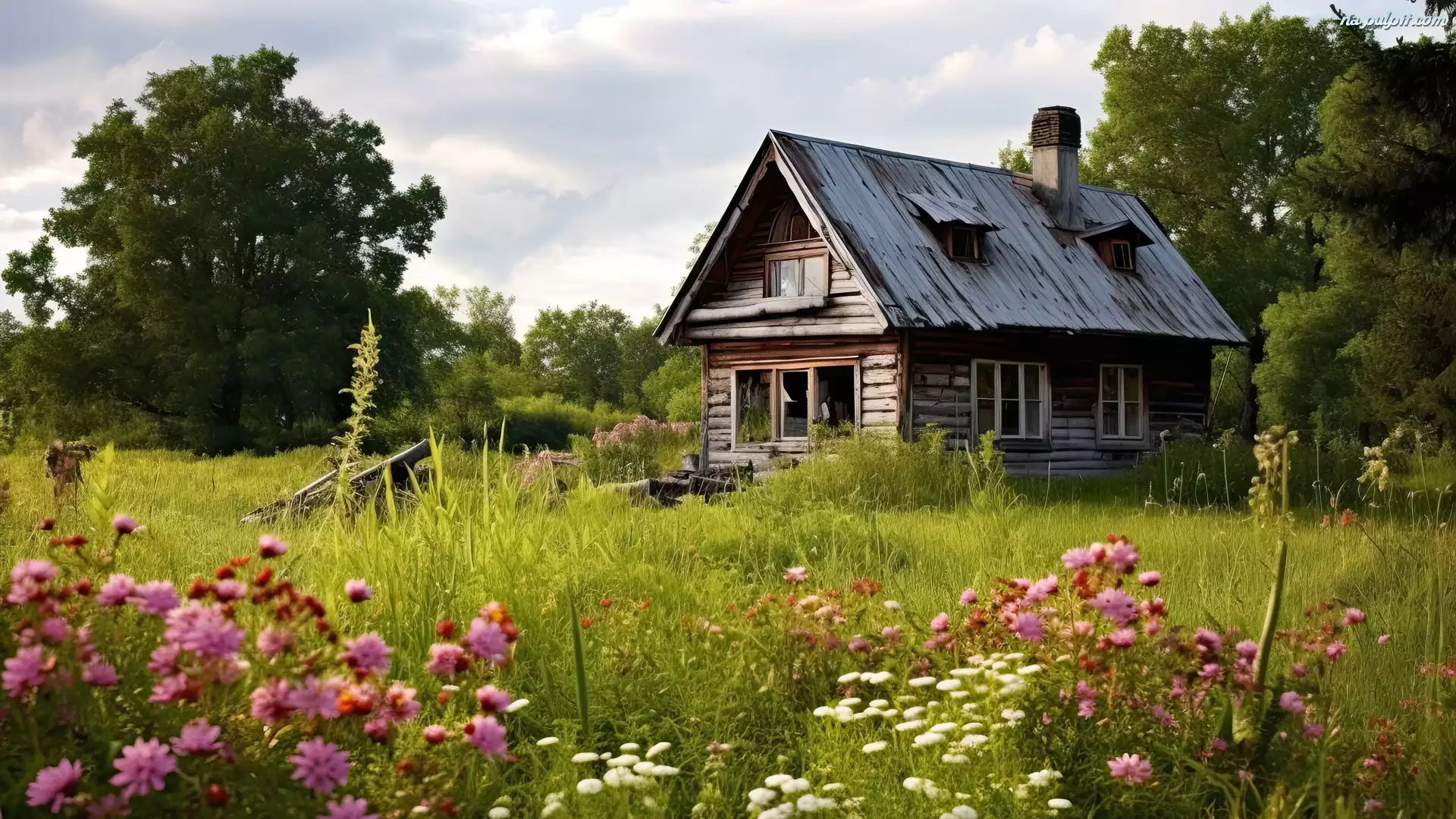 Drzewa, Drewniany, Łąka, Kwiaty, Dom, Trawa Na Pulpit