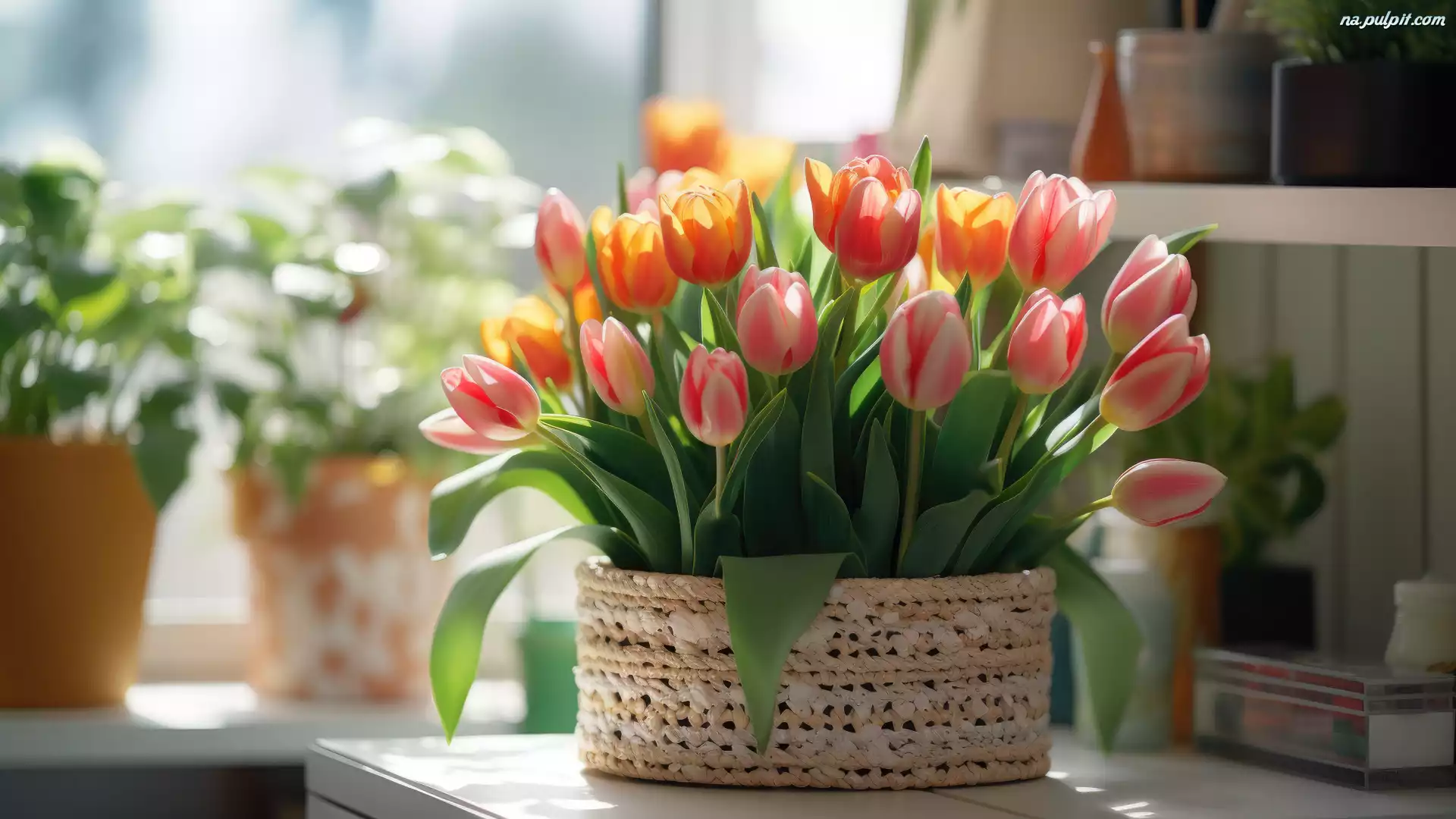 Doniczki, Kwiaty, Tulipany, Okno, Koszyk