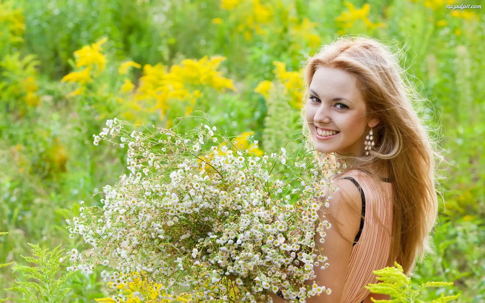 Kwiaty, Blondynka, Uśmiechnięta, Łąka Na Pulpit