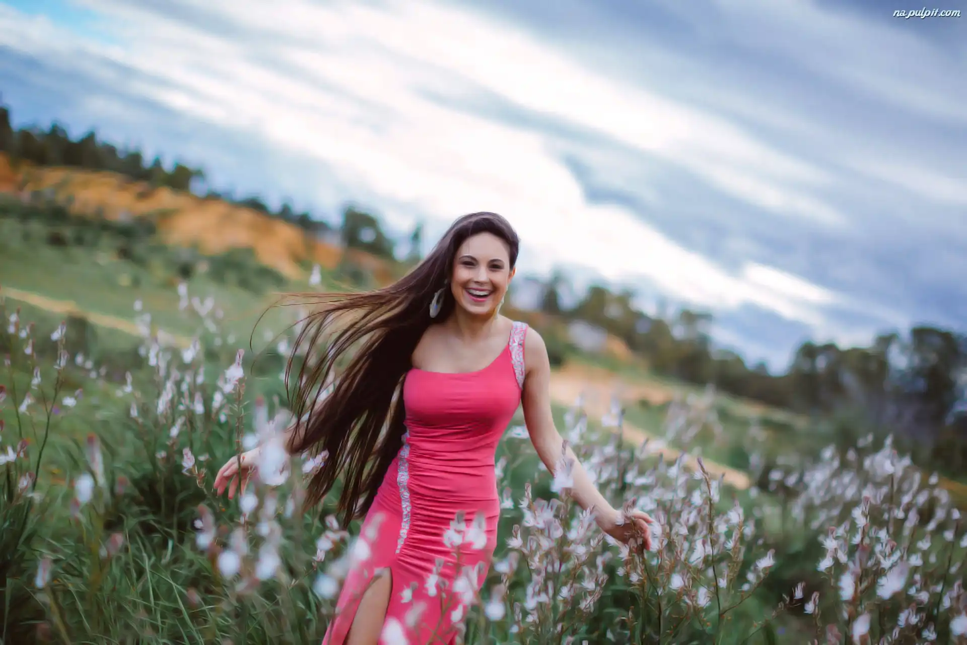 Kwiaty, Kobieta, Uśmiechnięta, Białe