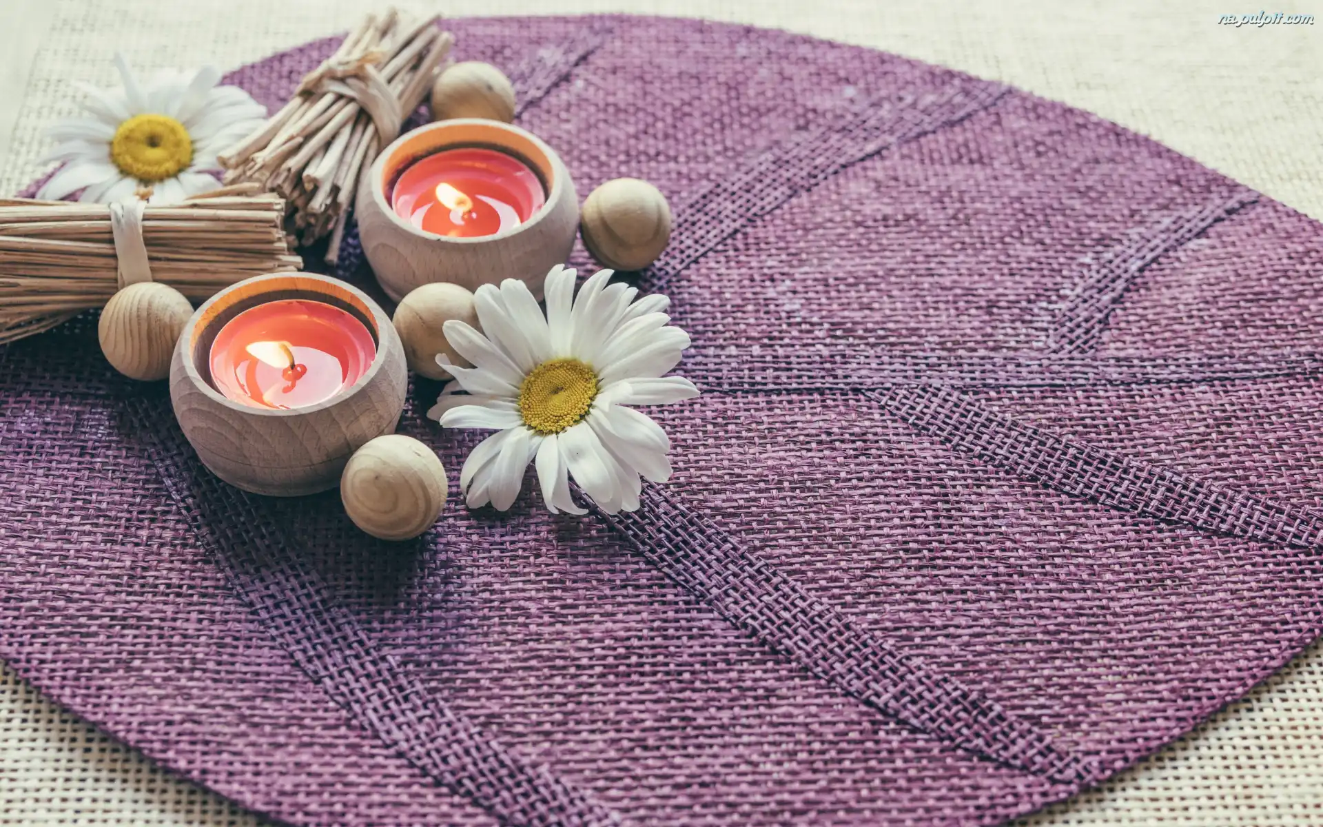 Kwiaty, Kulki, Podkładka, Margerytki, Świece, Drewniane