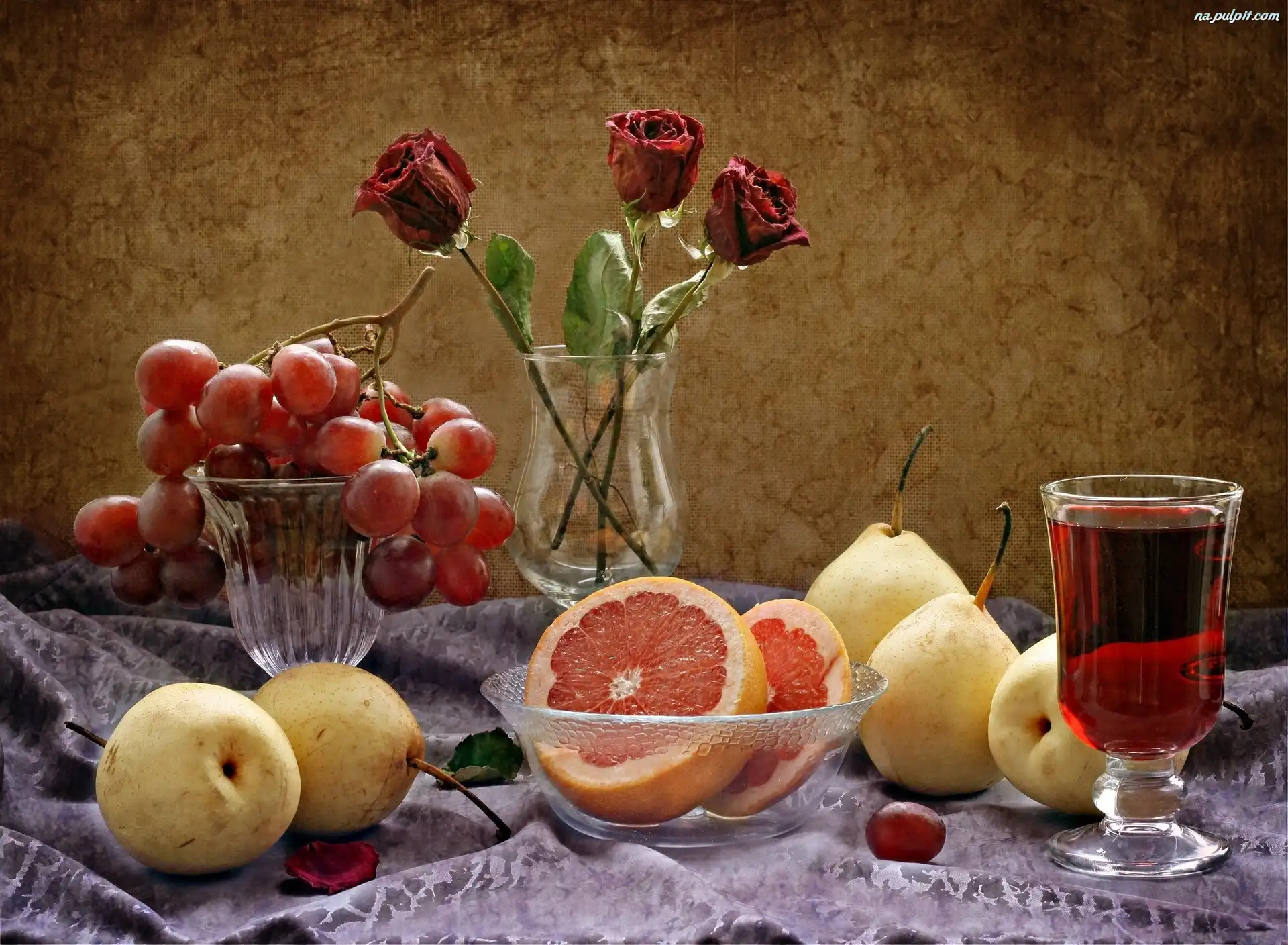 Kompozycja, Gruszki, Owoce, Wino, Grejfruty, Winogrona, Róże Na Pulpit