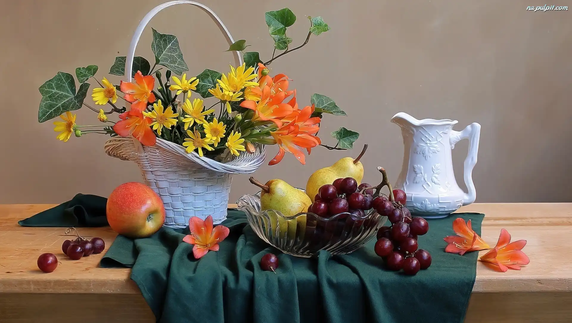 Winogrona, Kwiaty, Gruszki, Owoce, Alstremeria, Kompozycja, Jabłko Na Pulpit