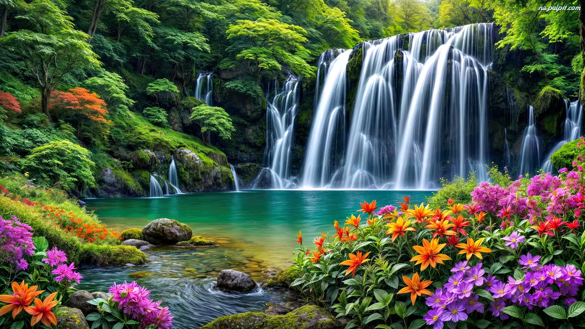 Wodospad, Kwiaty, Woda, Grafika, Las Na Pulpit