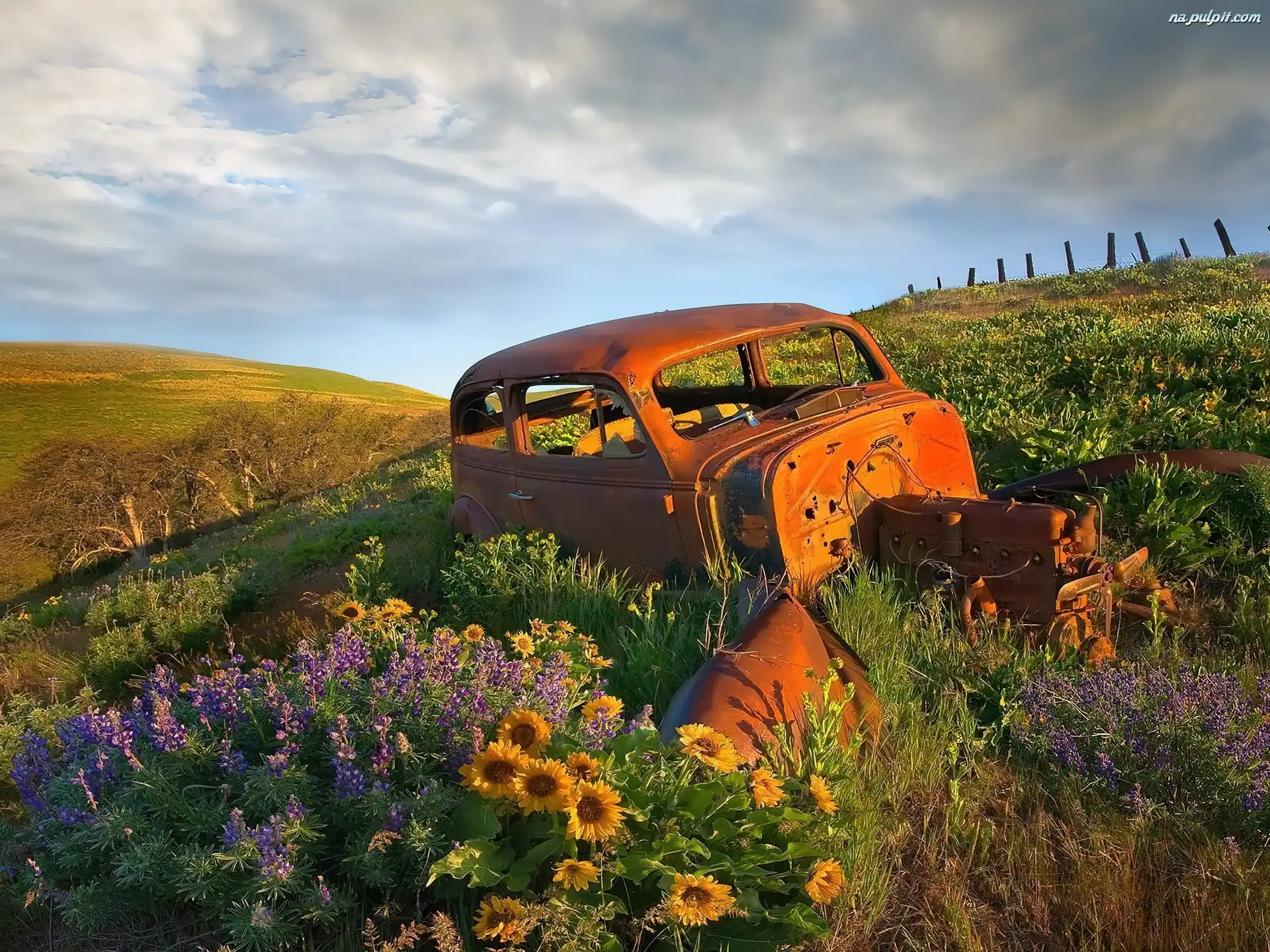 Kwiaty, Auta, Wrak, Łąka