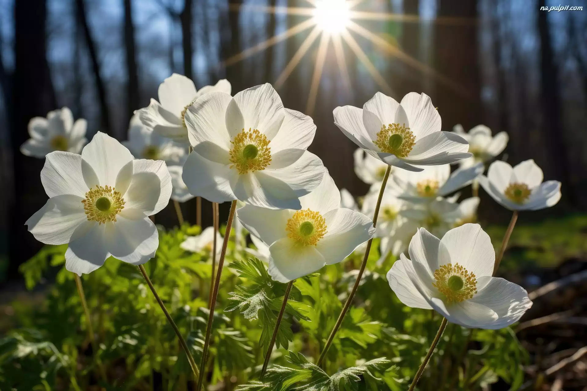 Promienie słońca, Zawilce, Kwiaty, Las, Białe, Grafika Na Pulpit