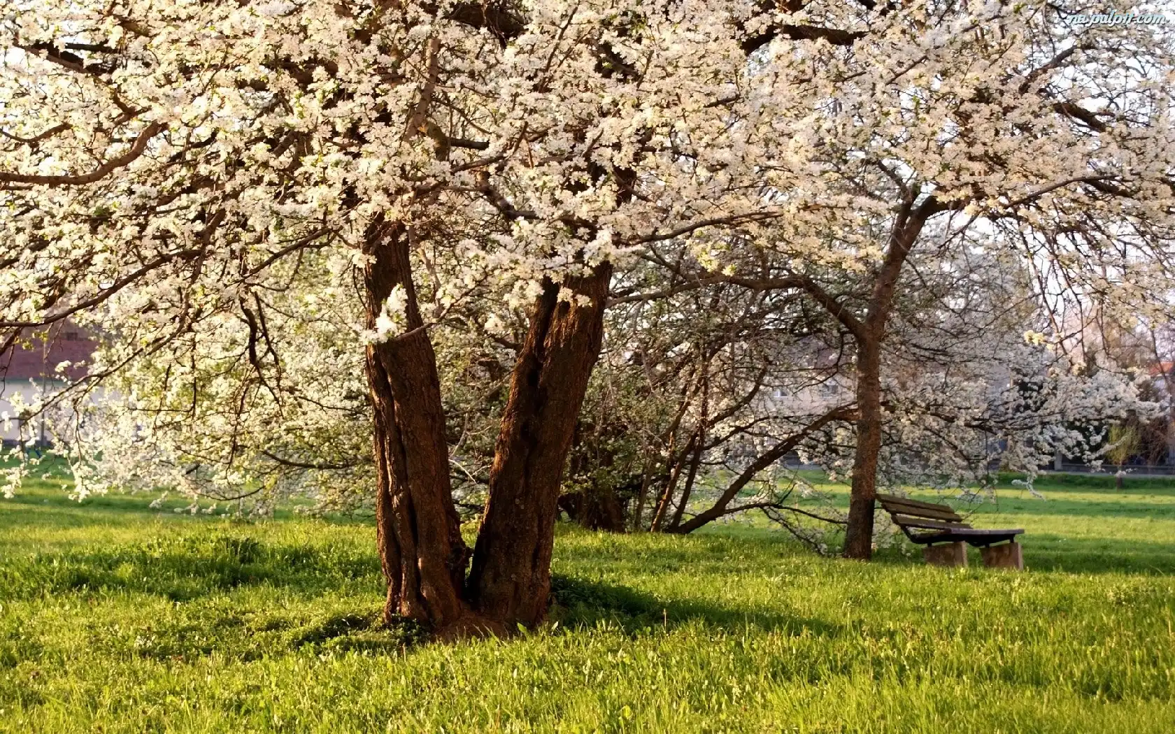 Ławka, Drzewa, Kwitnące, Trawa Na Pulpit
