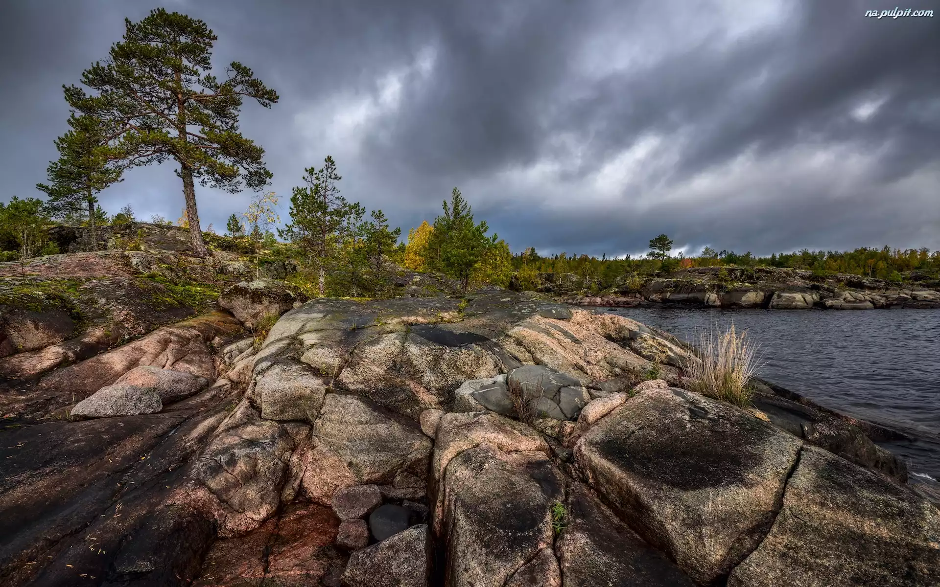 Skały, Jezioro, Jesień, Rosja, Chmury, Drzewa, Karelia, Ładoga Na Pulpit