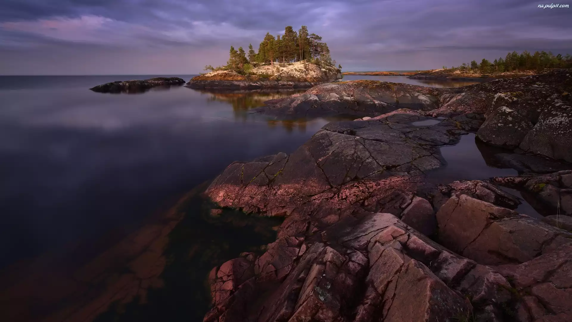 Skały, Jezioro, Wysepka, Rosja, Chmury, Drzewa, Karelia, Ładoga