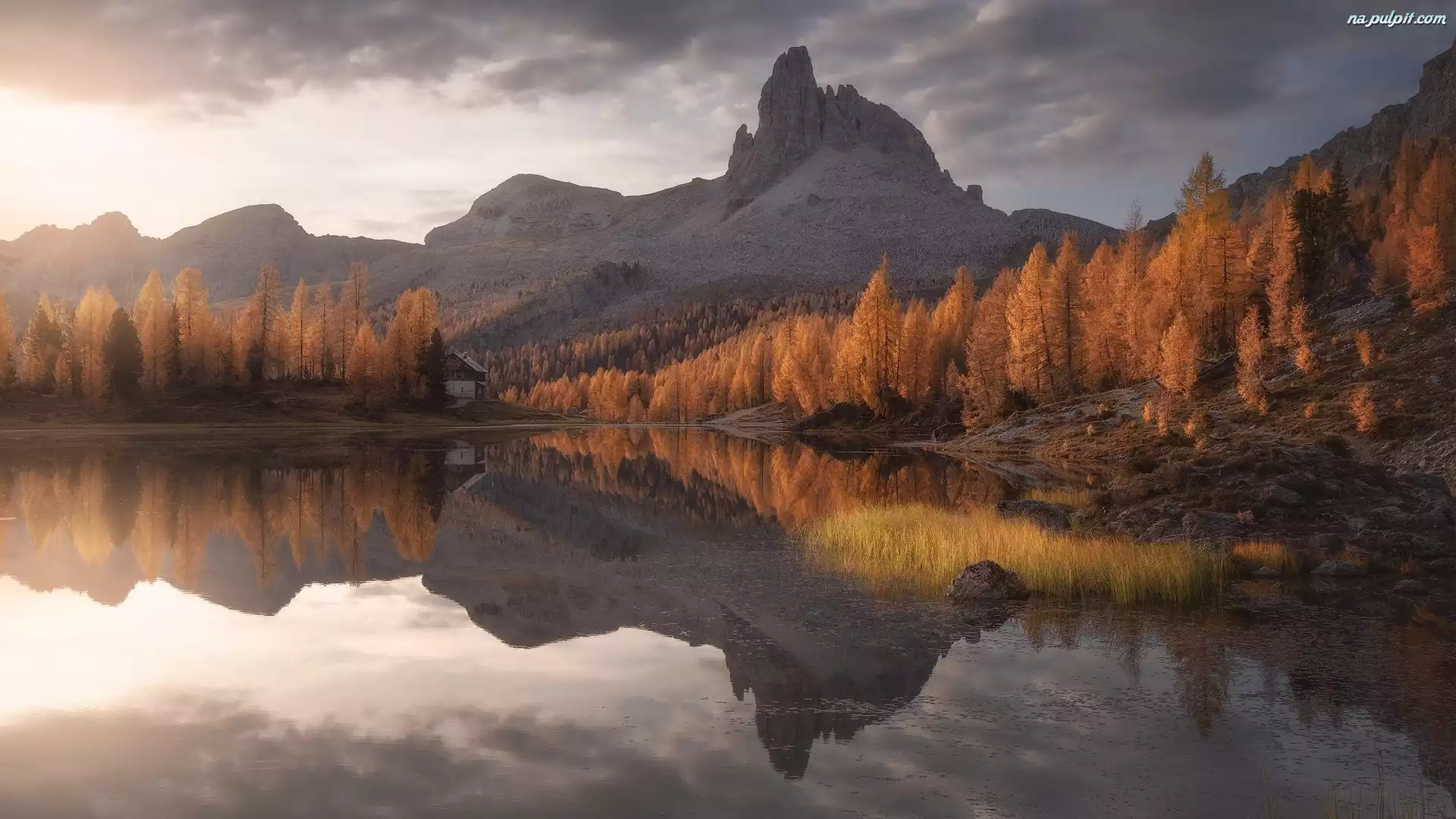 Modrzewie, Góry, Odbicie, Prowincja Belluno, Jezioro, Jesień, Włochy, Dolomity, Lago Federa, Drzewa Na Pulpit |