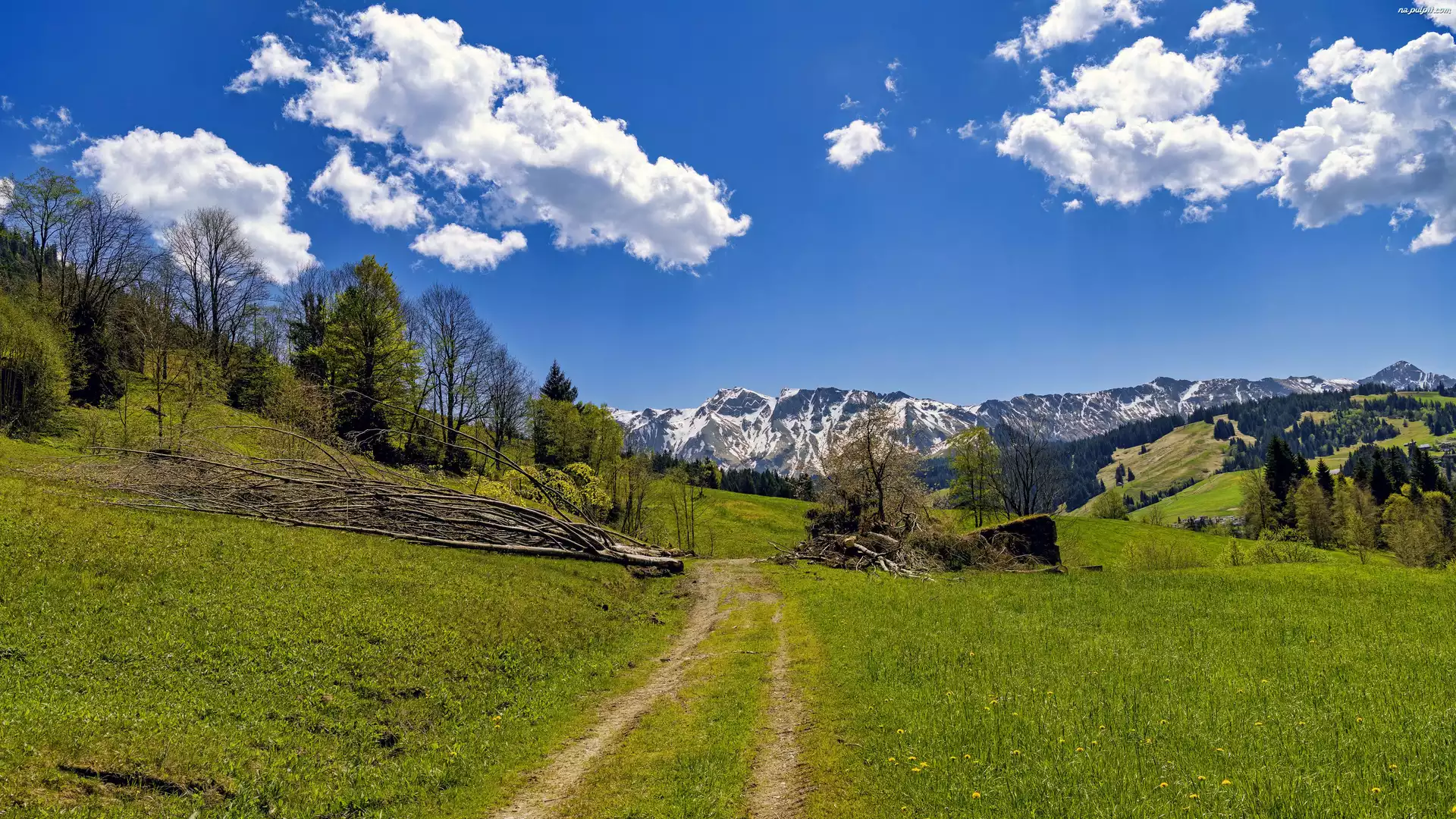 Chmury, Łąka, Drzewa, Niebo, Góry