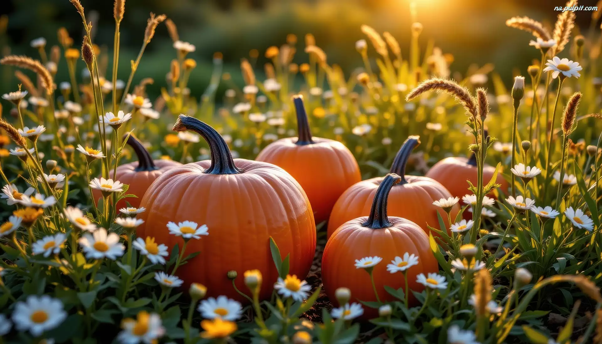 Dynie, Łąka, Kwiaty, Grafika AI Na Pulpit