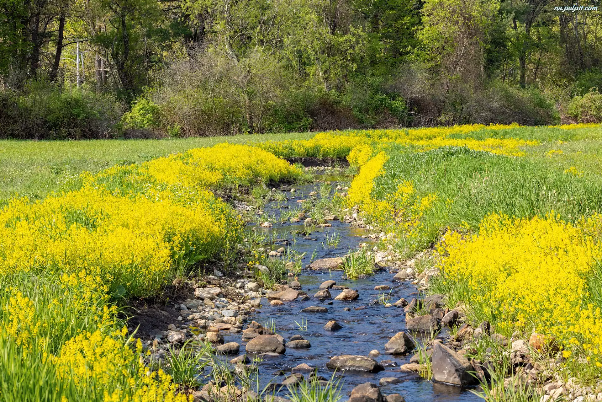 Rzeka, Łąka, Polne, Kamienie, Kwiaty