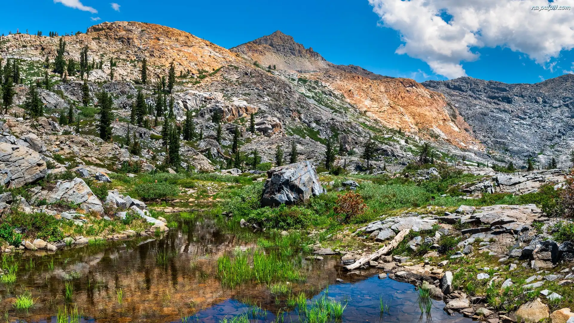 Kamienie, Staw, South Lake Tahoe, Góry, Stany Zjednoczone, Kalifornia, Sierra Nevada Mountains, Drzewa Na Pulpit |