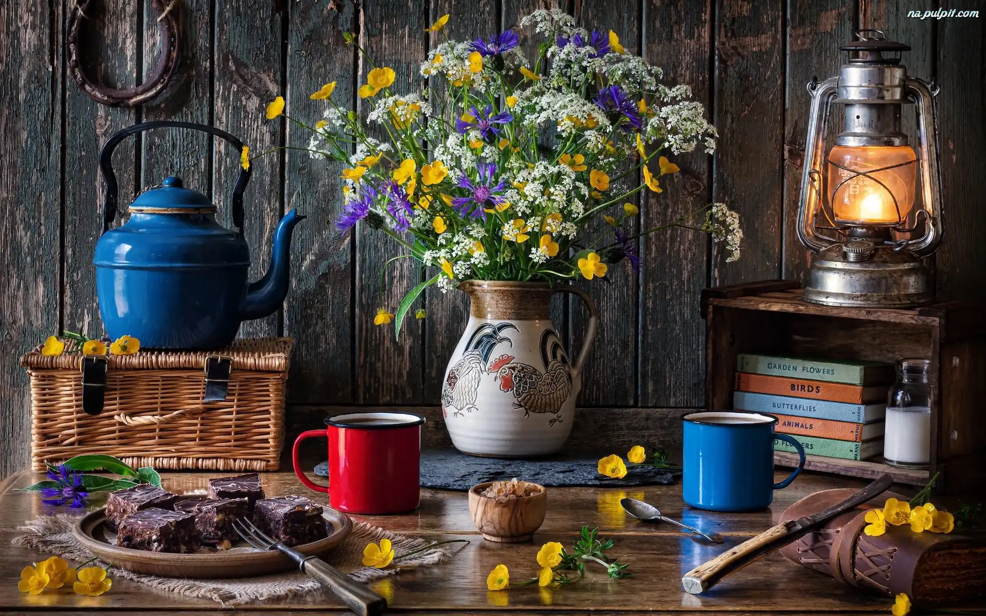Ciasto, Kompozycja, Czajnik, Lampa, Bukiet kwiatów, Kubki Na Pulpit