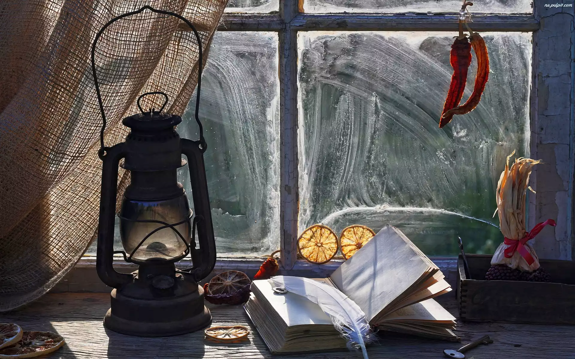 Lampa naftowa, Okno, Kompozycja, Książka Na Pulpit