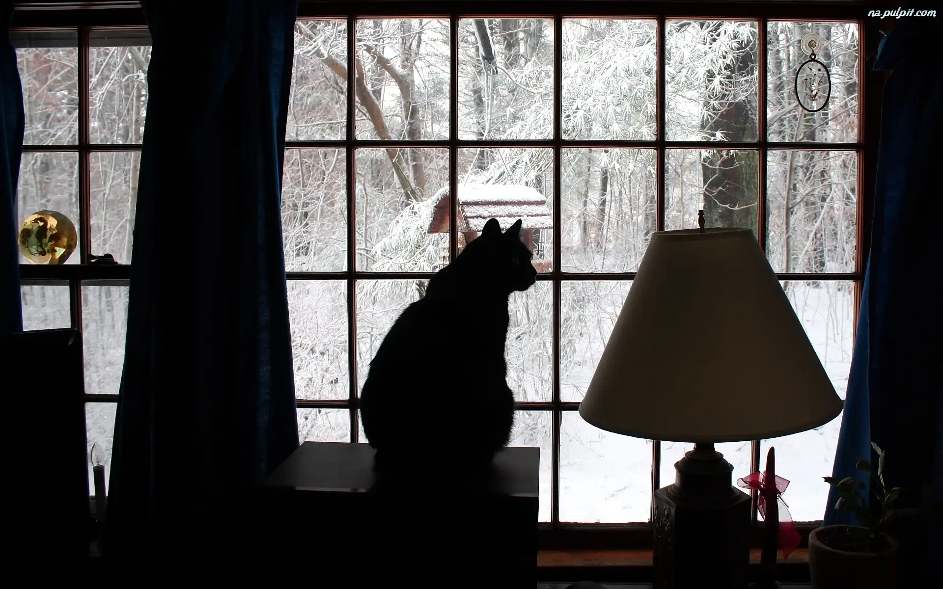 Lampa, Czarny, Okno, Zima, Kot Na Pulpit